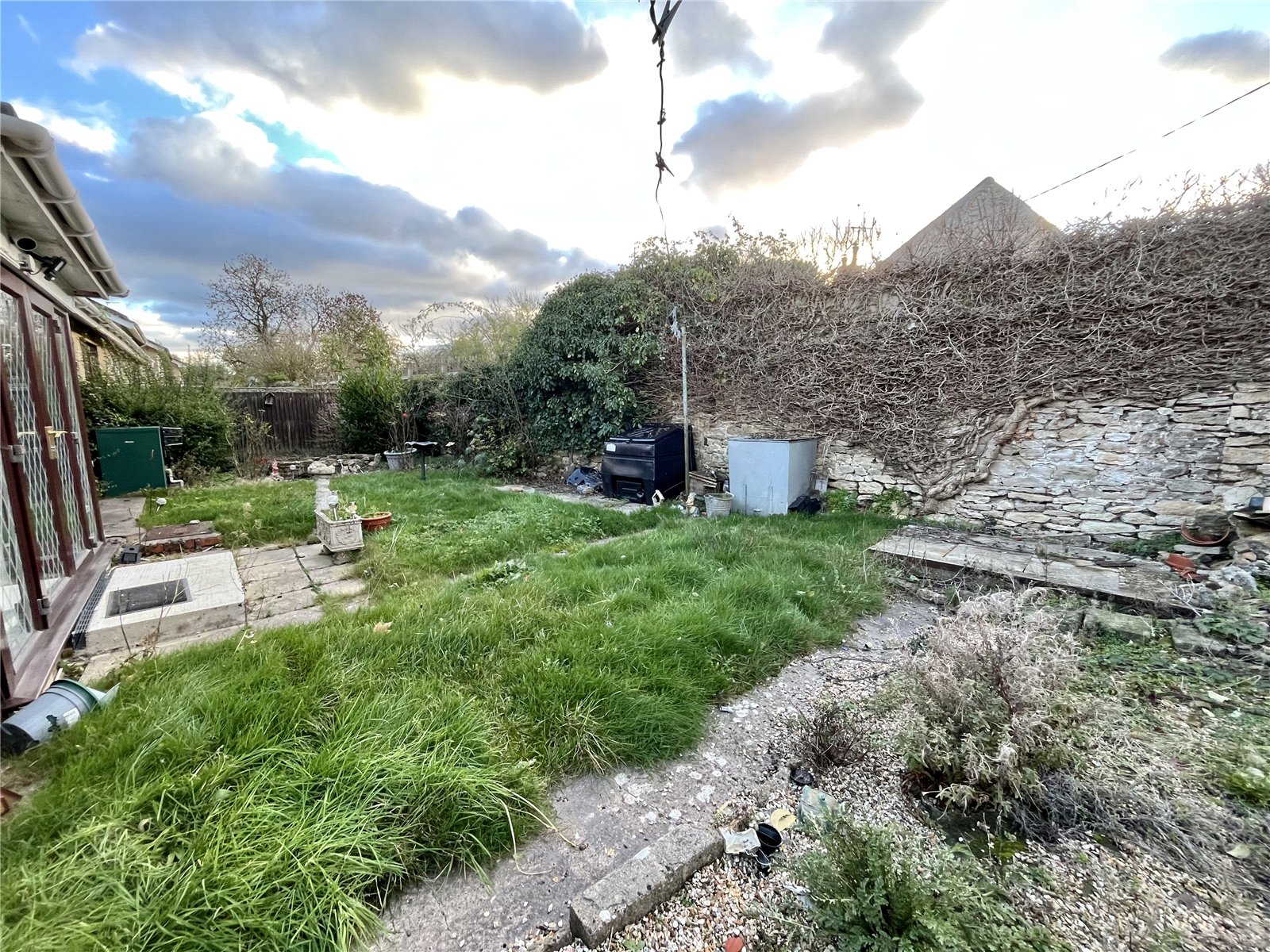 The garden is rectangular in shape with a rocky area and a small lawn. It is enclosed by a stone wall at the rear and fencing to both sides, with French doors from the conservatory opening directly onto the space and with access to a modest garage to right of the property.