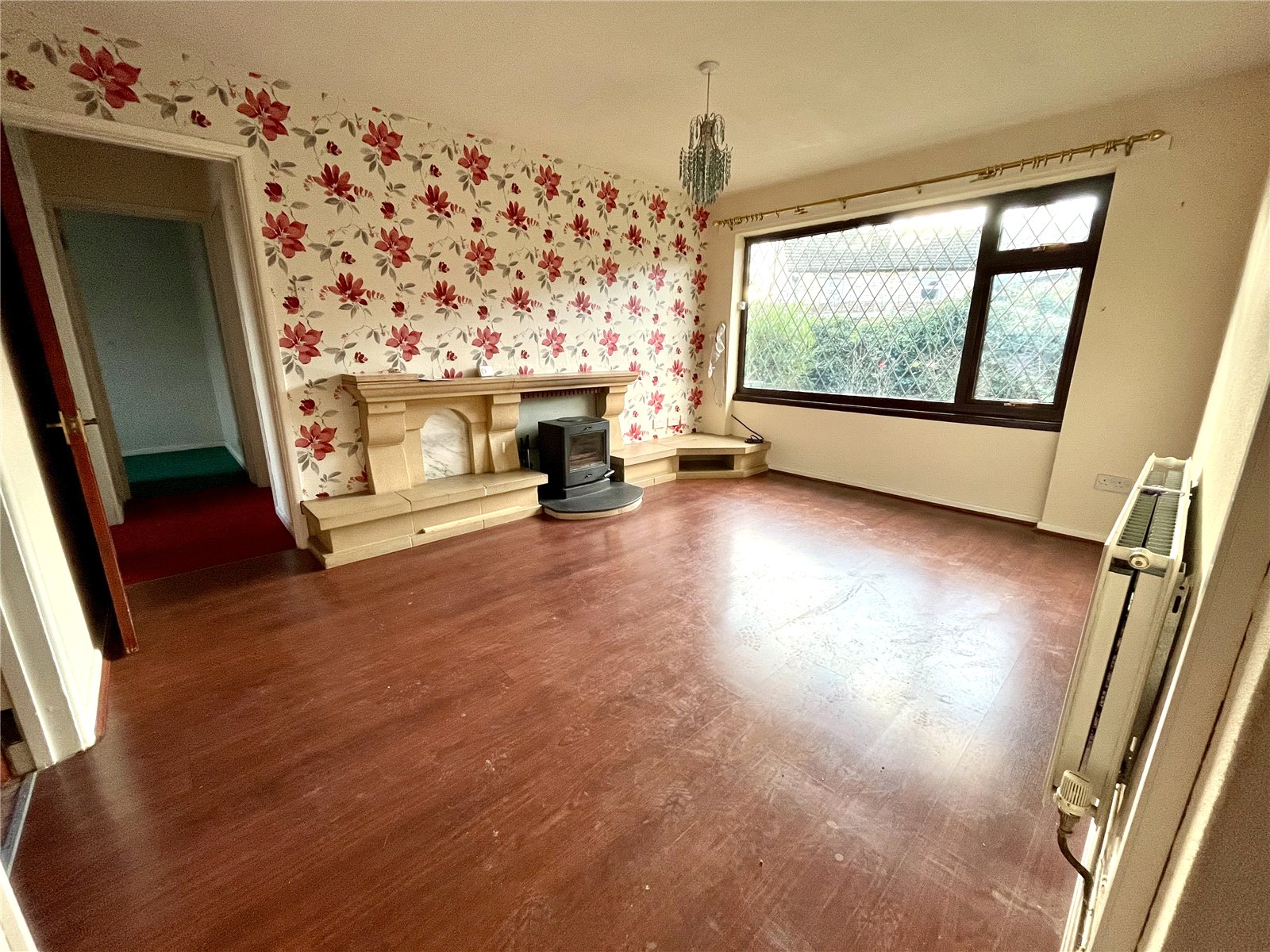 Turning left from the hallway brings you into the living room which benefits from a wide window that spans almost the full width of the room. There is a wood burning stove beneath a stone mantel and the same stonework extends into a built-in television stand that forms a stepped corner feature.