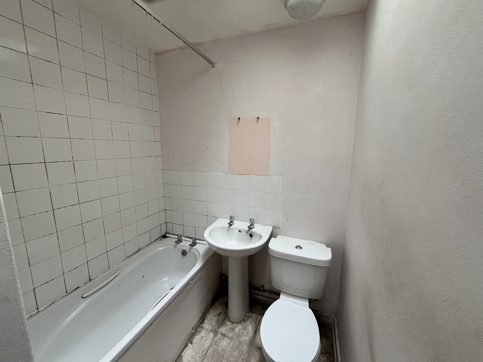 Bathroom: With a white suite comprising a panelled bath, pedestal wash basin, low level WC, night storage heater and roof light.