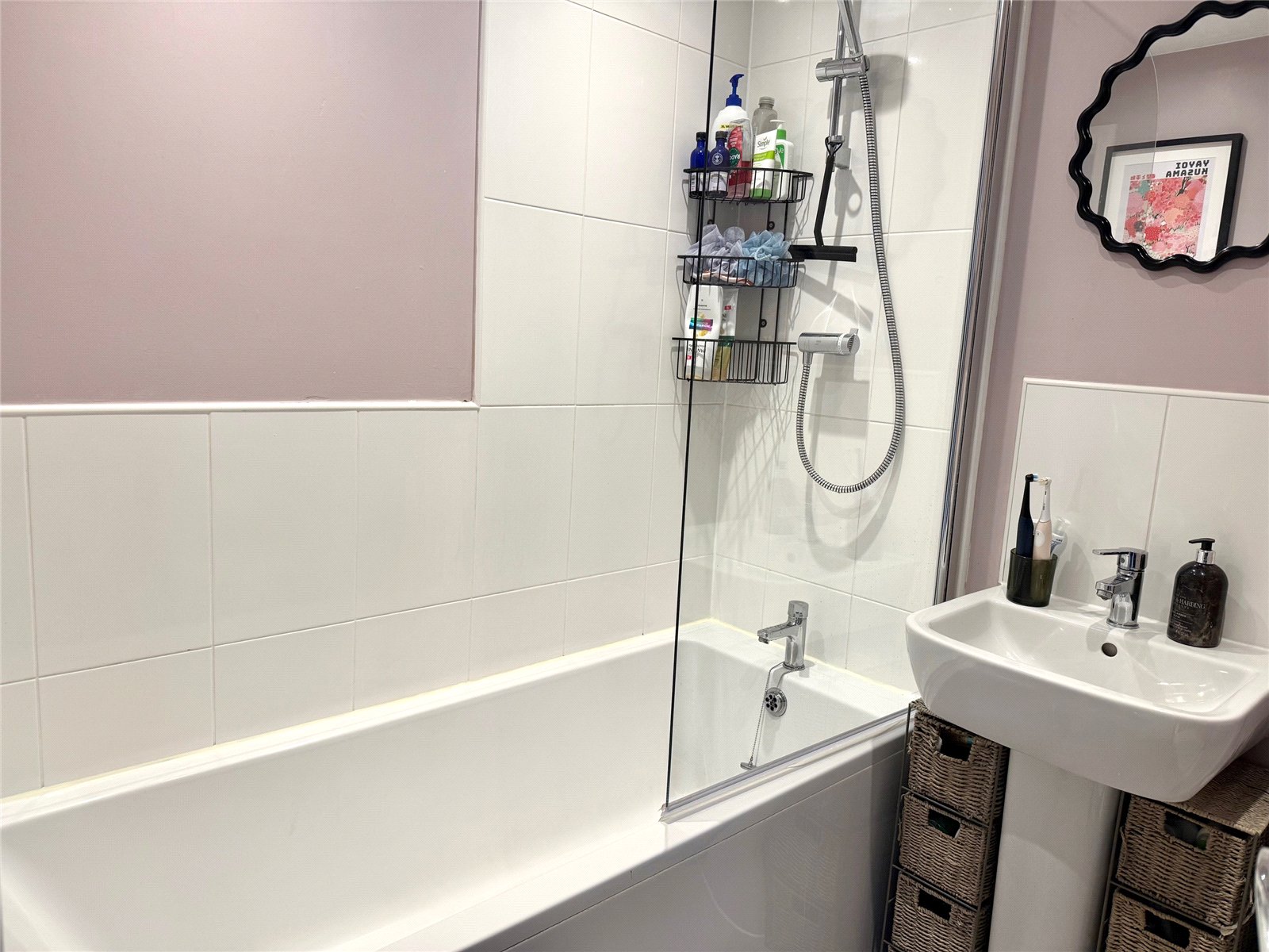 Bathroom: With a white suite comprising a panelled bath with adjacent ceramic wall tiling and a wall mounted thermostatic shower with glazed shower screen, pedestal wash basin, low level WC, chrome finish vertical towel rail/radiator and extractor.