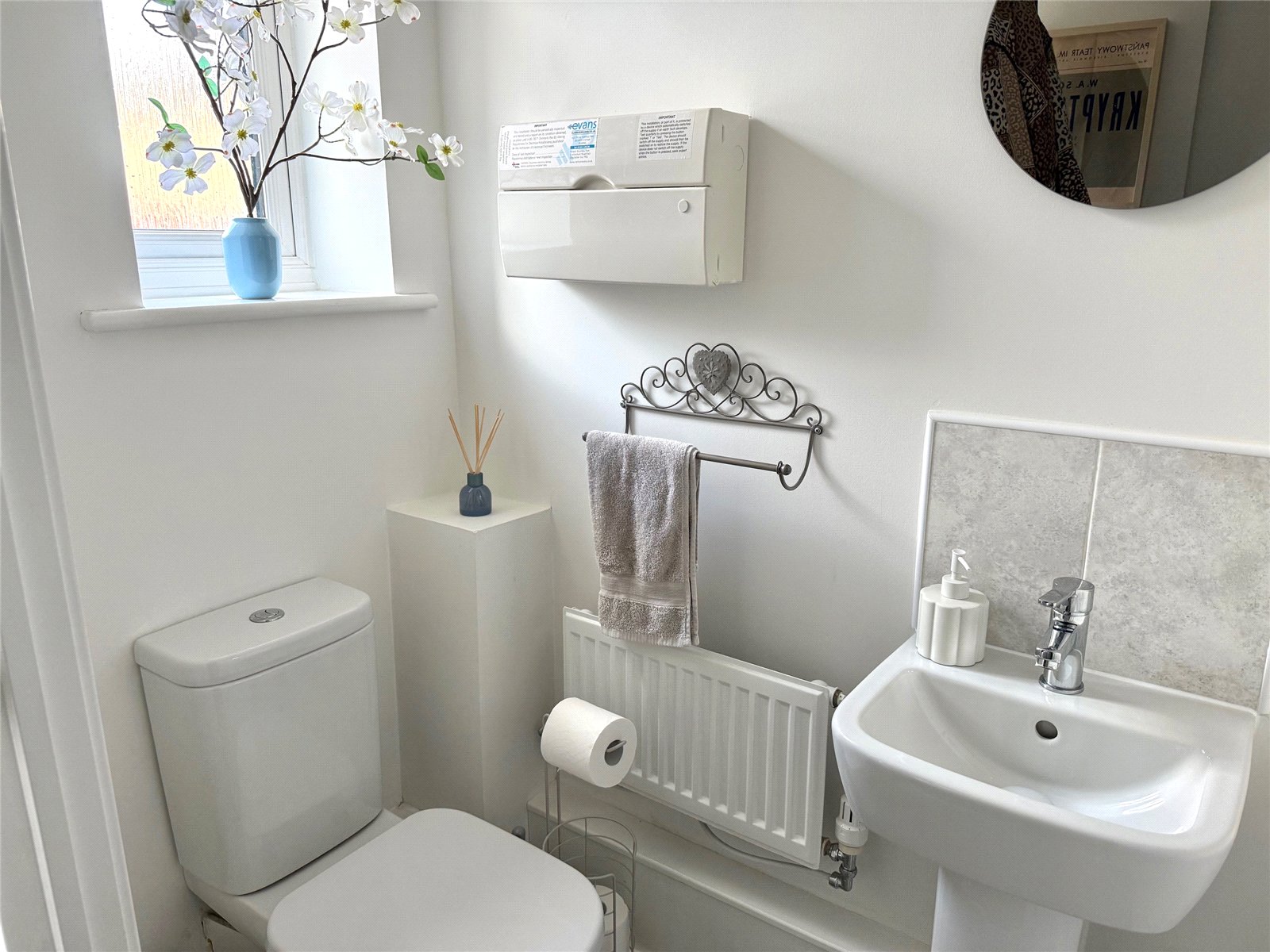 Cloakroom: With a white suite comprising a low level WC, pedestal wash basin with a tiled splash, radiator and a sealed double glazed window to the front.