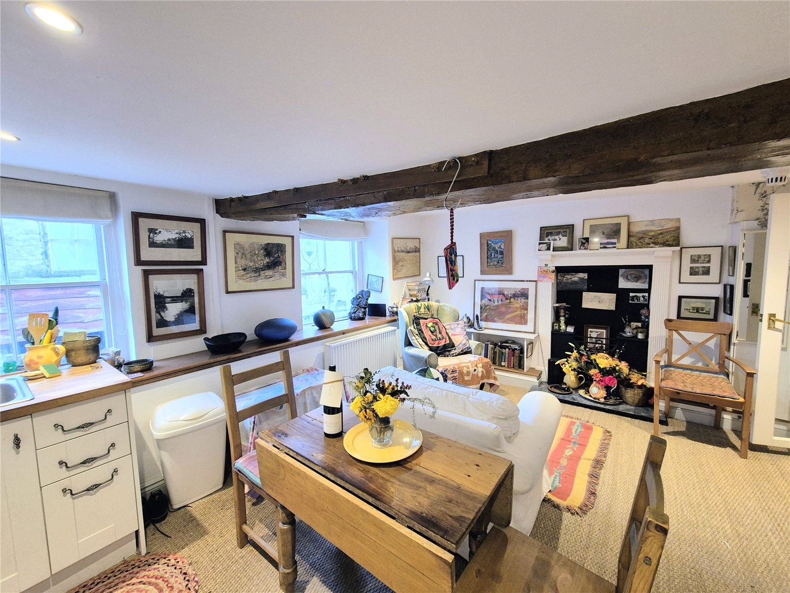 Entered directly from the front door, the open plan kitchen living and dining area benefits from two single glazed sash windows to the front elevation, an exposed central beam, and a decorative open fireplace. Rattan carpet runs throughout the space, with the layout lending itself comfortably to defined living, dining and kitchen zones.