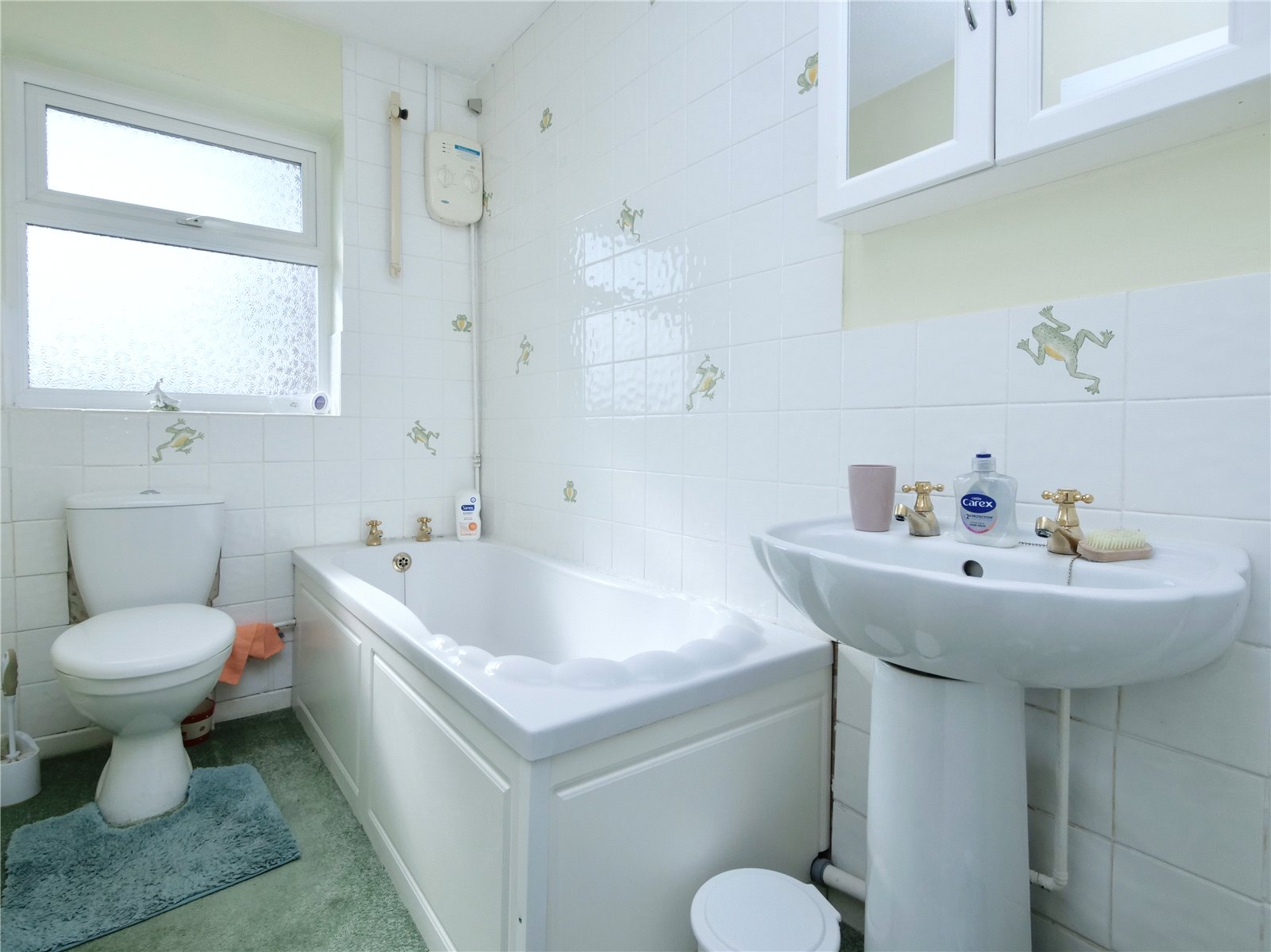 Bathroom: With a white suite comprising a panelled bath, adjacent ceramic wall tiling, low level WC, pedestal wash basin, radiator and an obscured double glazed window to the rear.