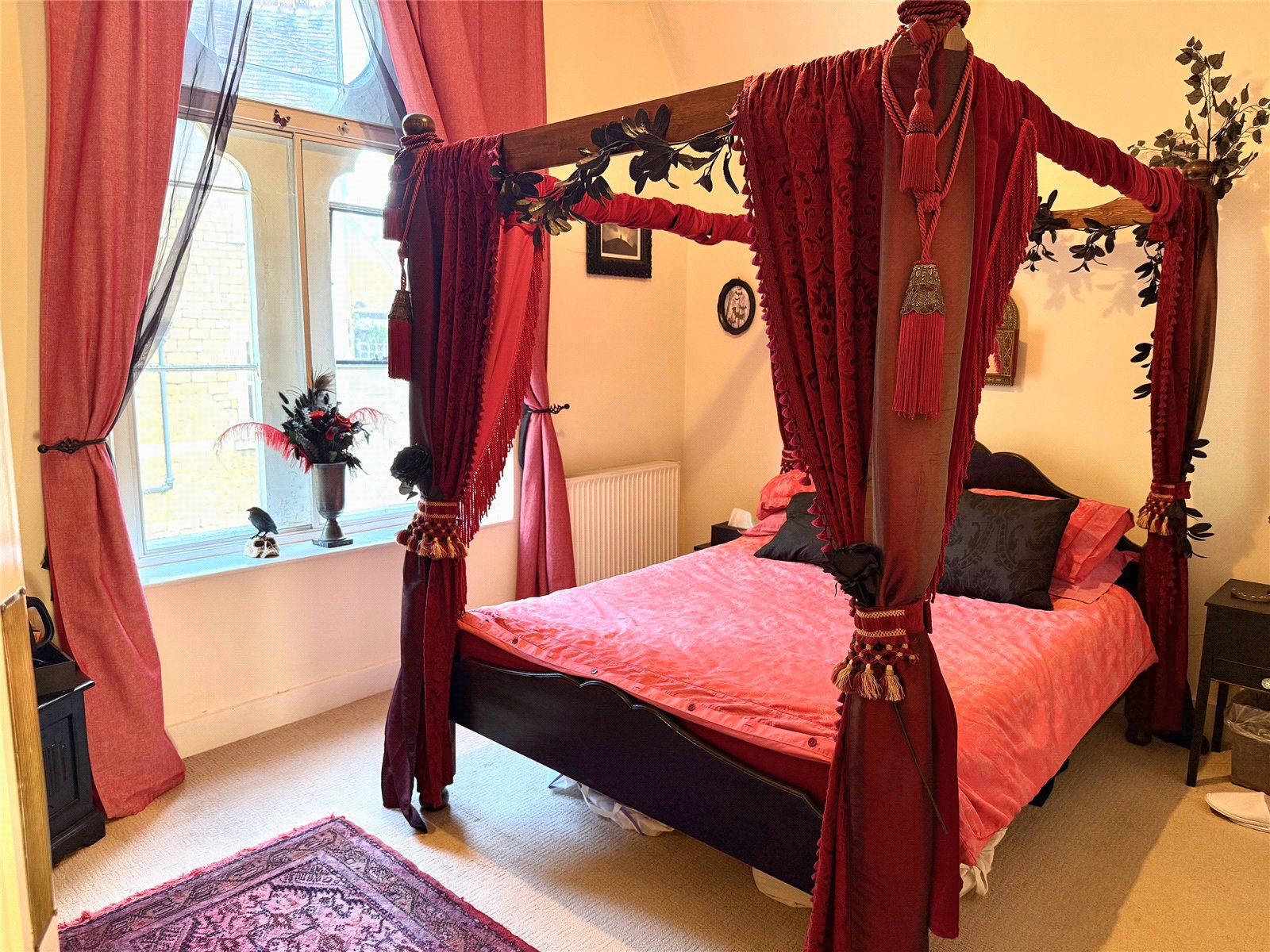 Bedroom 1: 12'10"x9'10" This room has superb high ceilings and an original window with beautiful stone surround to the side. Radiator.
