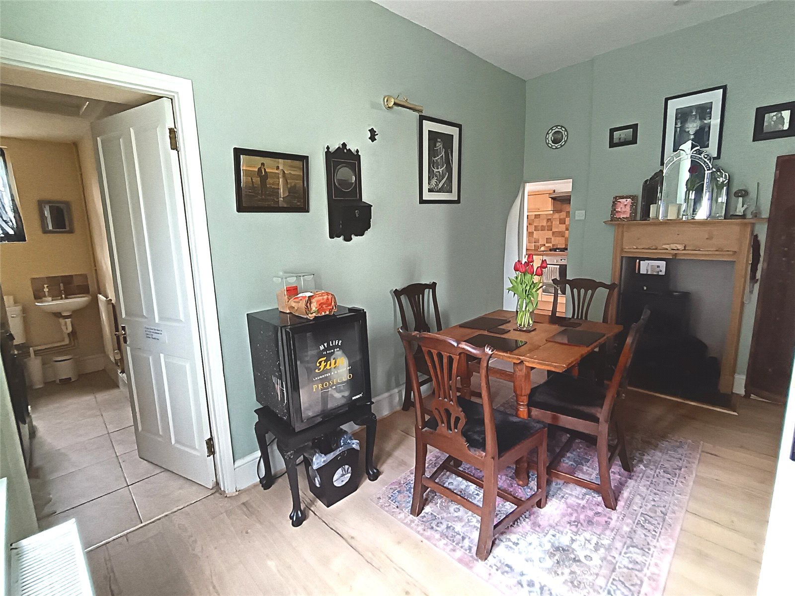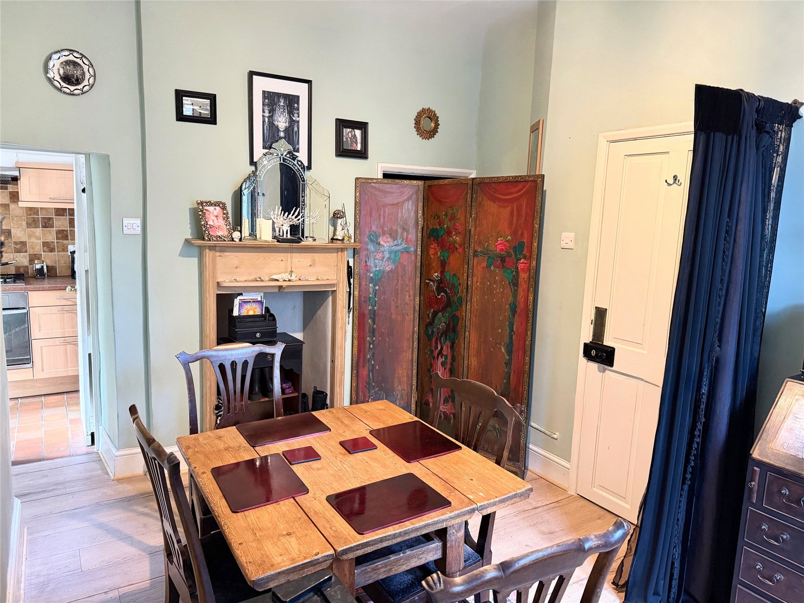 Dining Room: 13'x9'5" average. With an original window with stone surround to the side, meters cupboards, radiator, fireplace recess, access through to the kitchen and door to: