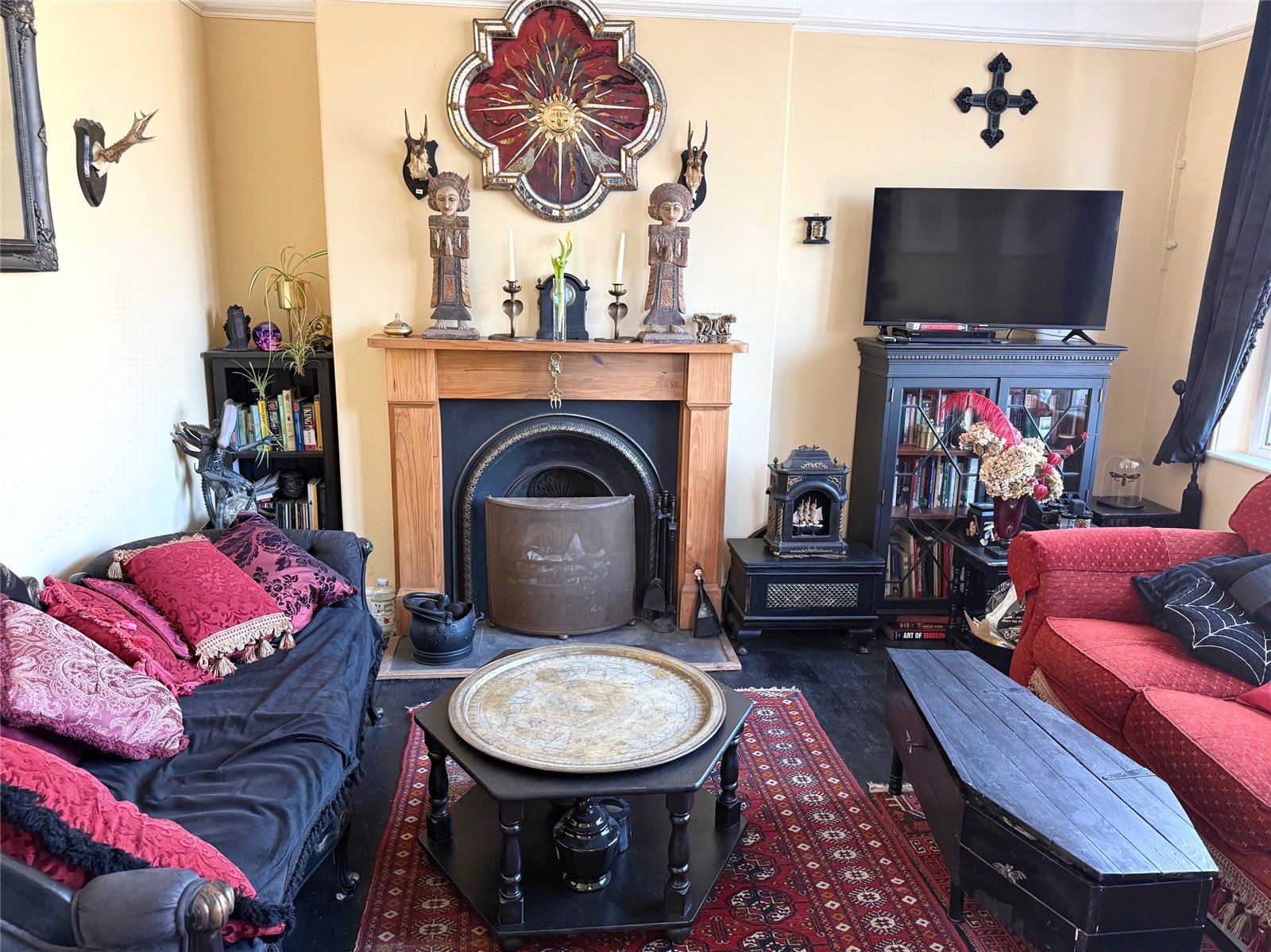 Sitting Room: 14'4"x12'7" With a fireplace with cast iron grate and decorative wood surround, painted floor boards, radiator and original windows to the front and side elevation. Picture rail.