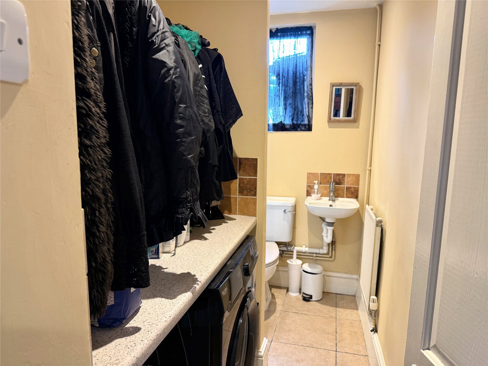 Cloakroom: With a white low level WC, wash basin, radiator and window to the rear.