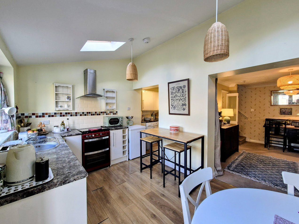 Kitchen/Dining Room: 14'8"x8'8" With a vaulted ceiling having two double glazed roof lights in addition to a double glazed window to the rear and double, sealed double glazed French doors to the garden. There is a good sized dining area with an adjacent radiator and a range of base cupboard units incorporating a stainless steel single drainer sink with a mono bloc mixer tap, a slot-in cooker with a gas four ring hob and gas oven. Extractor hood. Access through to: