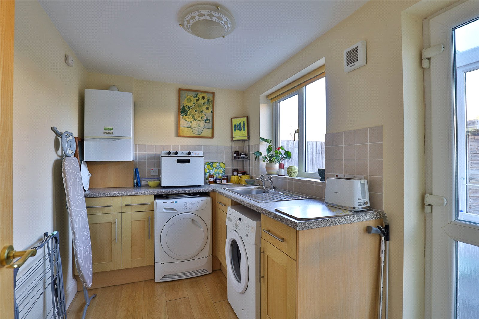 Utility Room: With a range of base cupboard units incorporating a stainless steel finish single drainer sink, space and plumbing for a tumble drier and washing machine, wall mounted Vaillant gas fired combination boiler which was serviced in November 2025 and supplies domestic hot water and central heating to radiators. Single radiator, double glazed window to the rear and a double glazed door to: