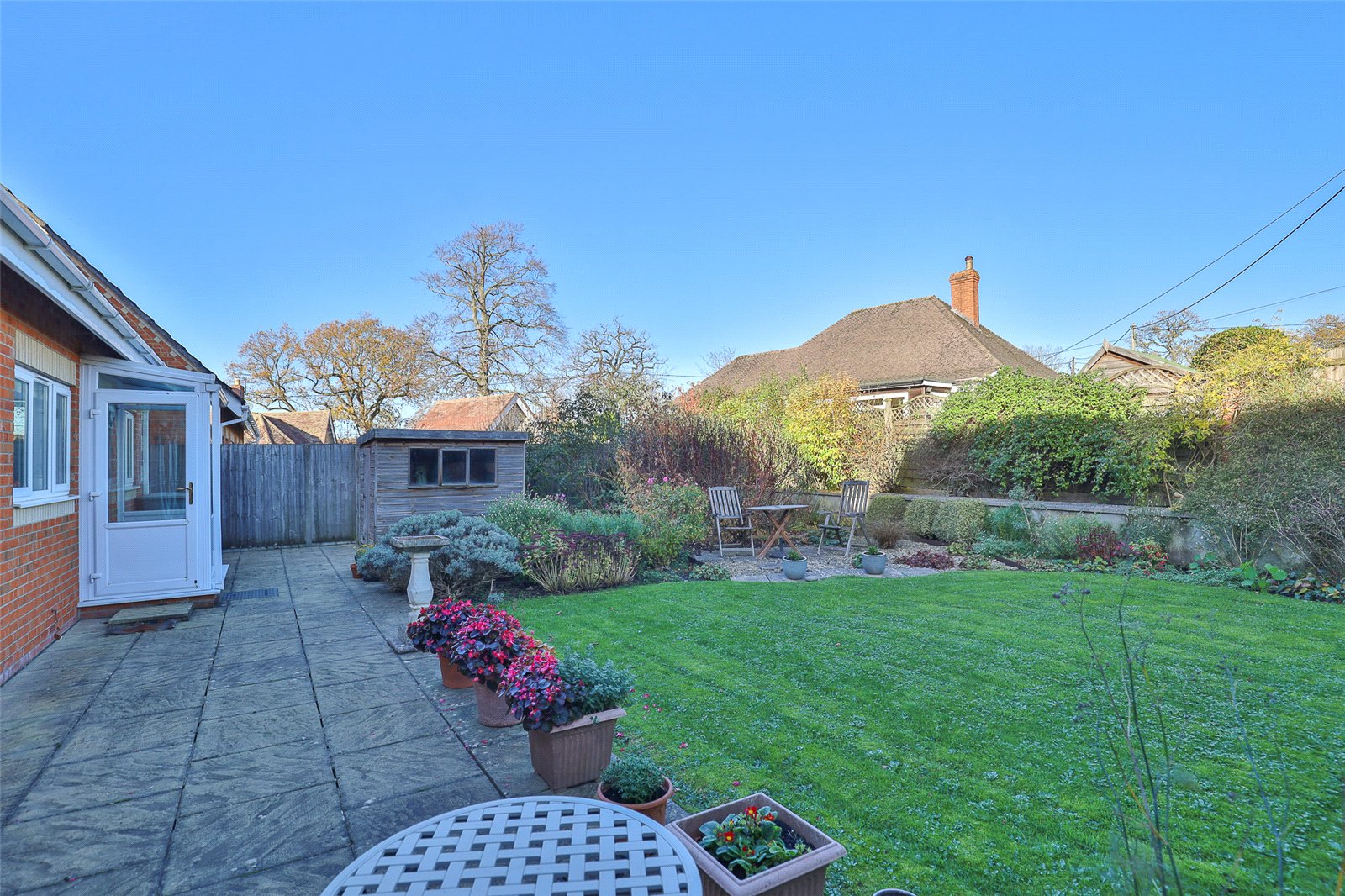 The rear garden is of a generous size and comprises an almost full width paved terrace beyond which is a sculpted lawn with flower beds, shrubs and bushes and has a wooden garden shed. The garden is enclosed mainly by timber fencing and enjoys a good degree of privacy.