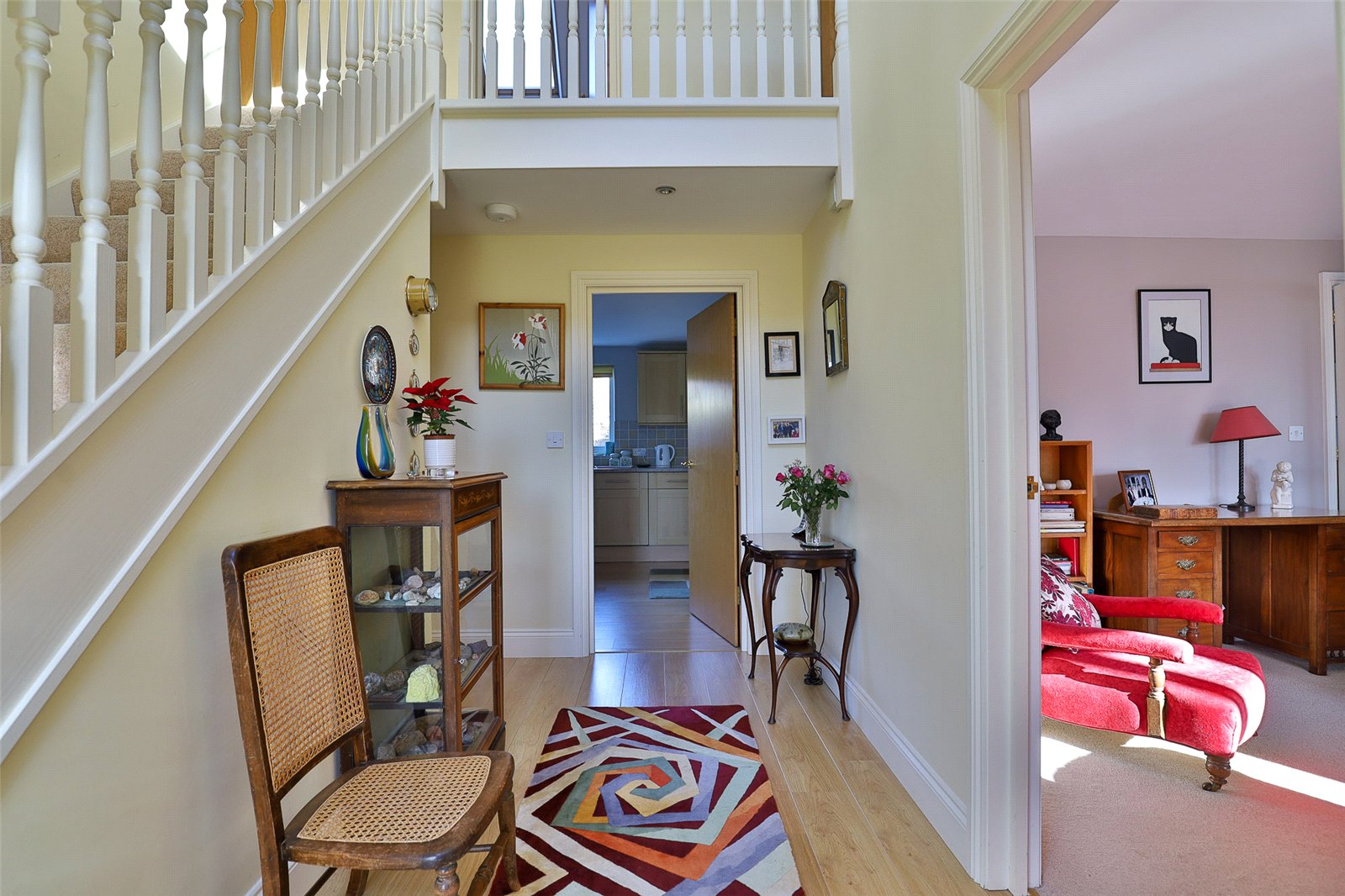 Entrance Hall: With a galleried landing and double height ceilings, staircase rising to the first floor with an understairs storage cupboard, part glazed, panelled front door and double glazed side panel, radiator.