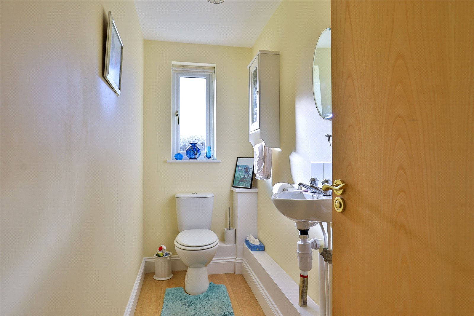Cloakroom: With a white suite comprising a low level WC, wash basin, radiator and an obscure double glazed window to the front.