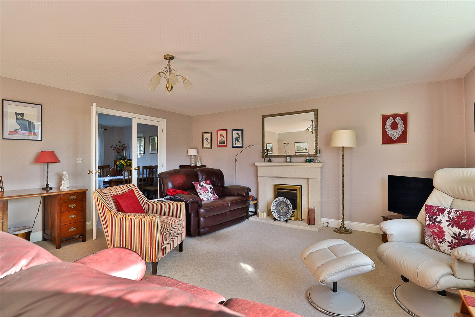 Lounge: With a double glazed window to the front, gas fire with a decorative stone surround, two radiators and double, glazed doors through to: