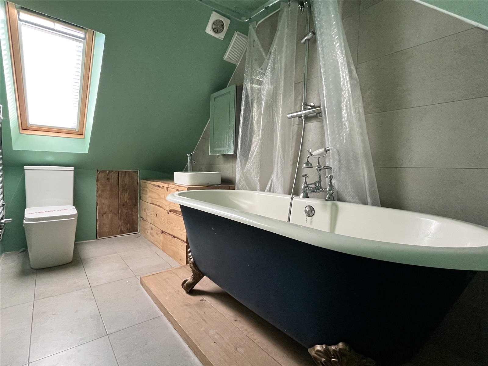 Ensuite Bathroom: With a claw and ball roll-top bath with a wall-mounted thermostatic shower, vanity with inset washbasin, low level WC, chrome-finish towel rail/radiator and a double glazed roof light to the front slope.