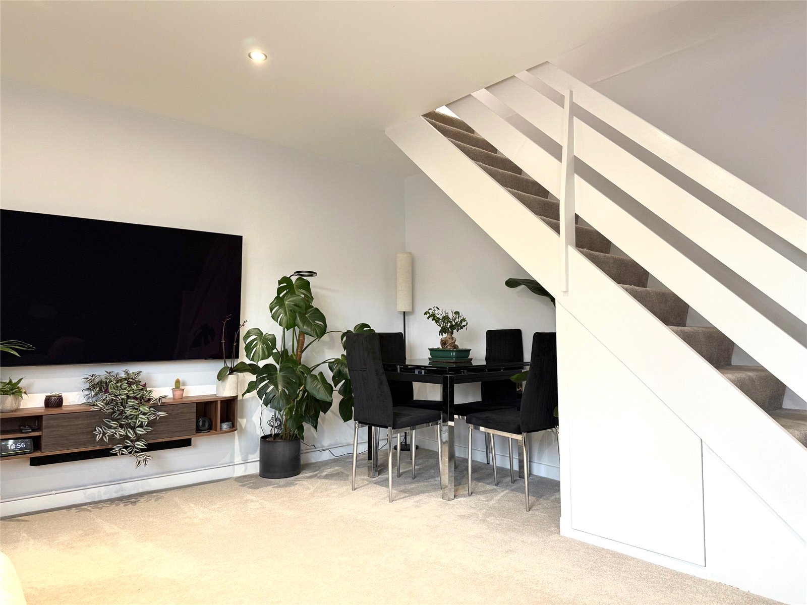 Lounge: 14'9x13'7" With a large double glazed window to the front, contemporary vertical radiator, understairs recess suitable for a dining table and chairs, understair cupboard, staircase rising to the first floor and door to:
