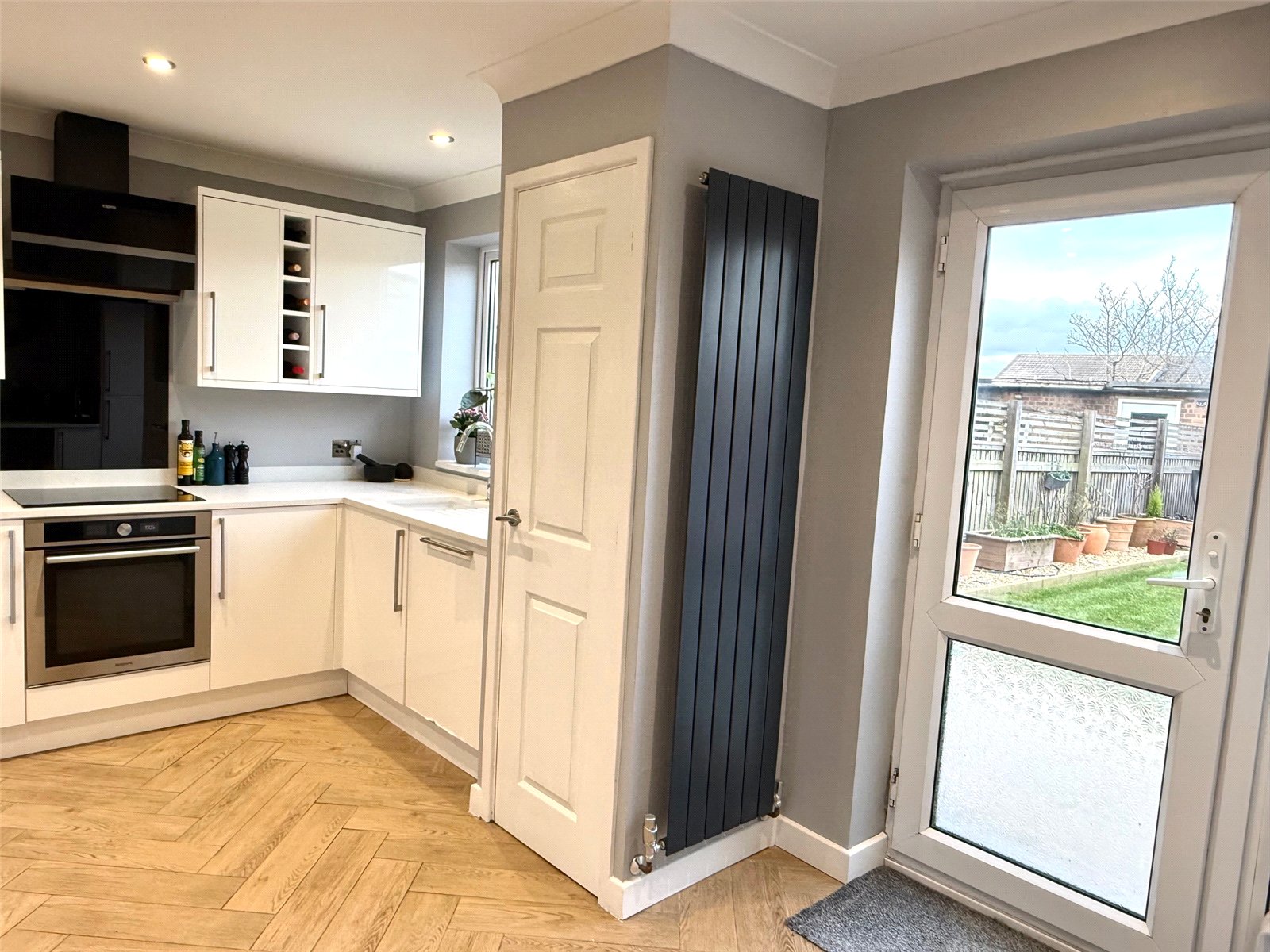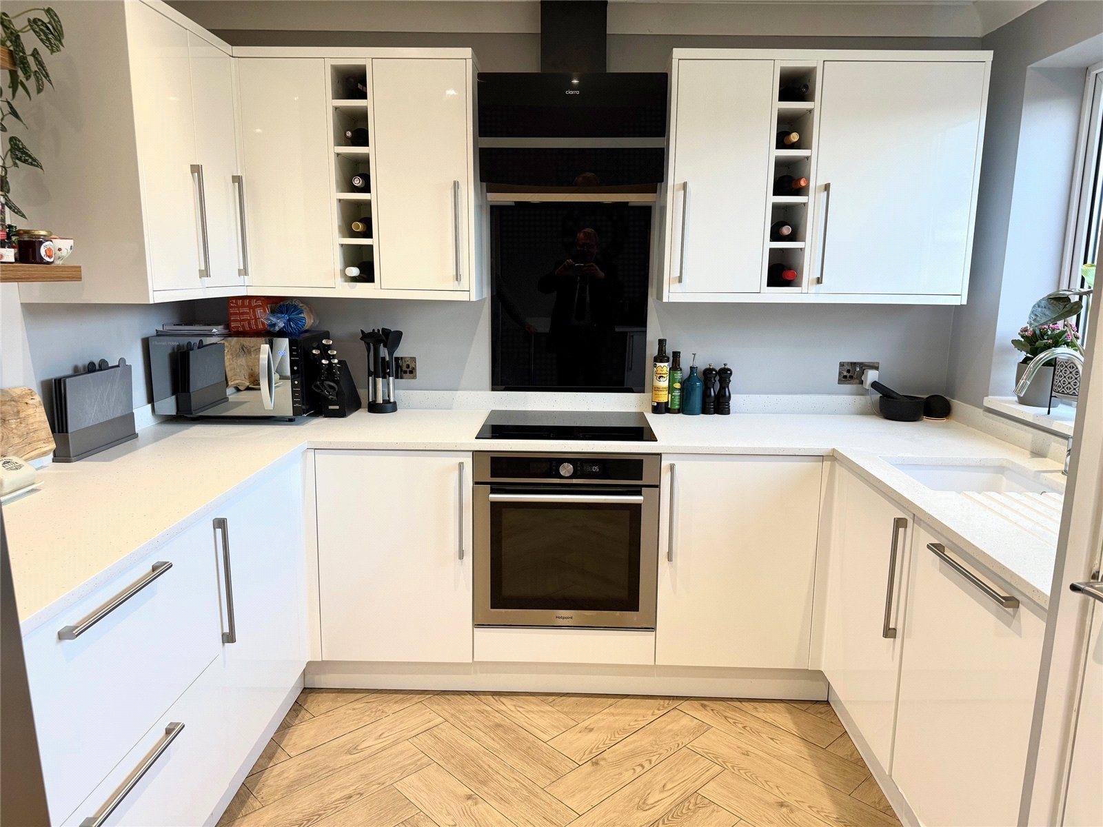 Kitchen/Breakfast Room:14'9"x9'5" With a comprehensive range of white high gloss fitted units with Minerva composite work surfaces incorporating a recessed sink, adjacent work surfaces with drawers and cupboards beneath and incorporating a Hotpoint fan assisted oven and four ring induction hob with splash back and hood above, full size dishwasher and washing machine, wall cupboard units, space for a large fridge/freezer with a cold water supply, further base cupboard units, tiled floor, double glazed window to the rear, cupboard housing a Worcester Bosch gas fired combination boiler which was installed approximately eighteen months ago. Radiator and double glazed French door onto the rear garden.