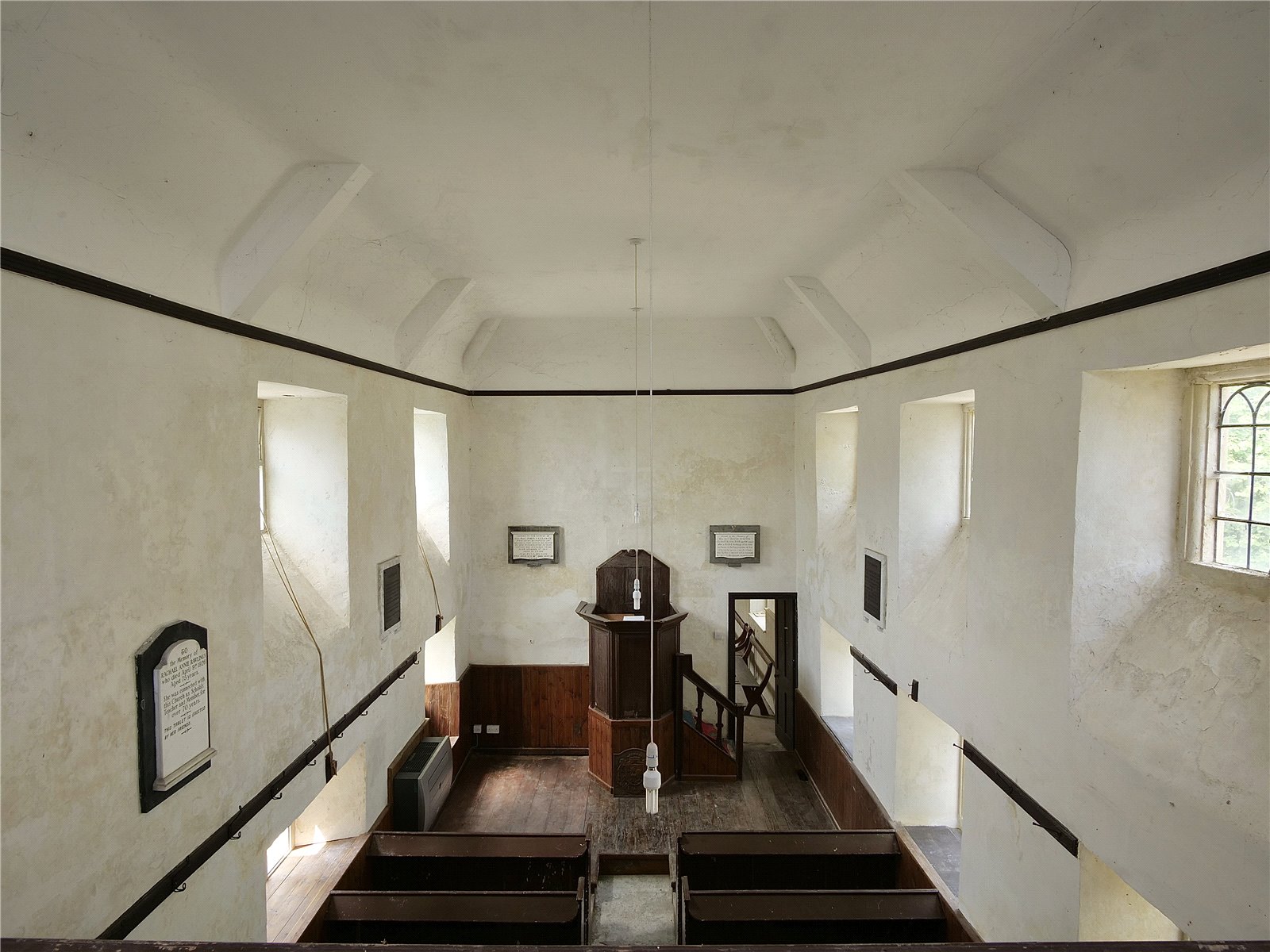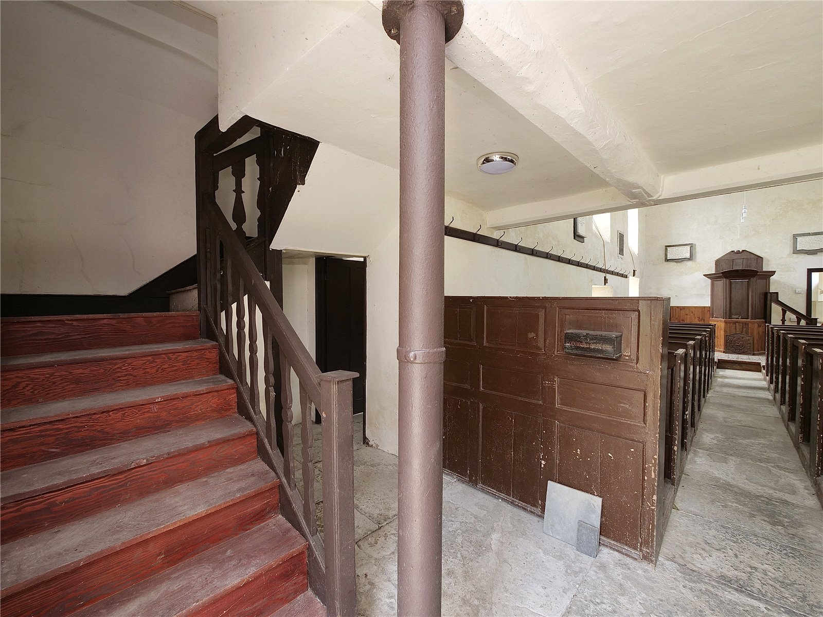 Main Hall: 39'10"x13' average. With the main ceiling rising to 17'. There are windows to both sides with stone mullion to the northern side and later wooden to the south. A pulpit creates a focal point to the western wall. There is a staircase and half landing rising to the mezzanine, flag stone flooring and access to an inner lobby with understairs cupboard and door to: