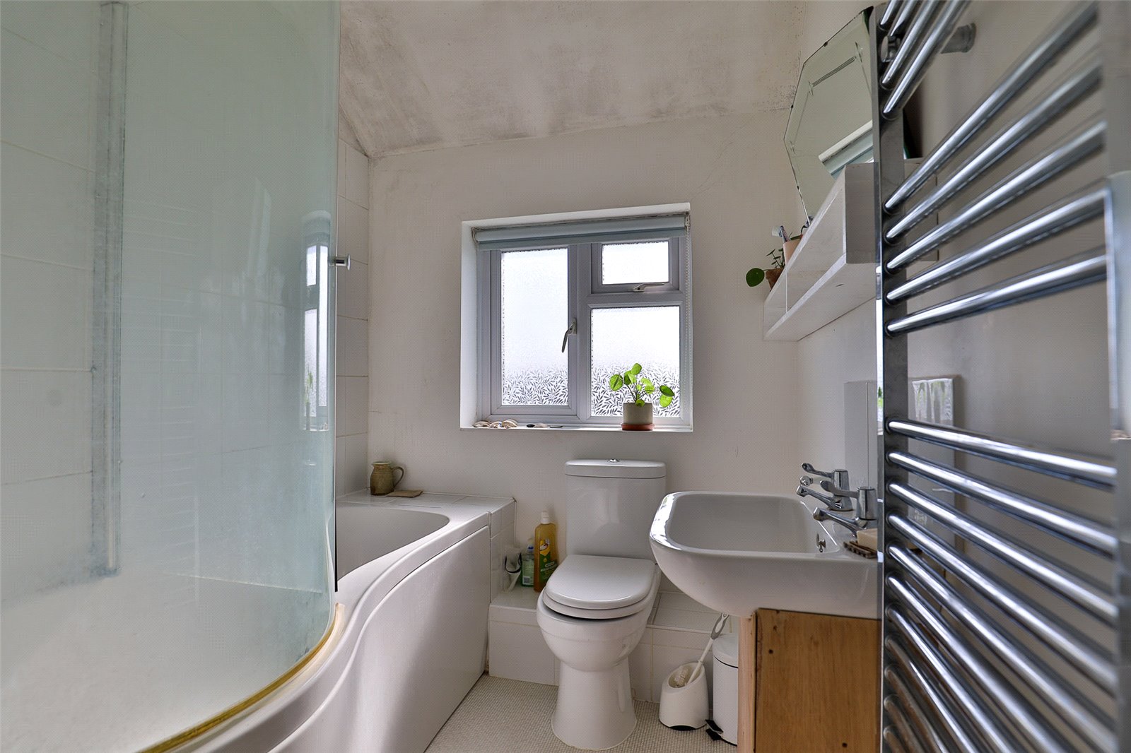 Bathroom: With a panelled shower bath with adjacent ceramic wall tiling, thermostatic shower and glazed shower screen, low level WC, wash basin, chrome finish vertical towel rail/radiator and an obscure double glazed window to the front.