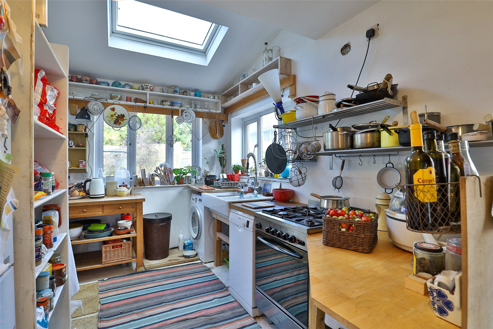 Kitchen/Dining/Family Room: 20'3"x18'7" Divided into three with electric under floor heating throughout and incorporating a fireplace, two double glazed roof lights to the rear slope, windows to the side and rear and sealed double glazed French doors onto the rear garden. Porcelain double bowl sink, space and plumbing for a washing machine, slimline dishwasher and cooker. Pocket glazed sliding doors from the lounge and further glazed pocket door to the entrance hall, part glazed door to the: