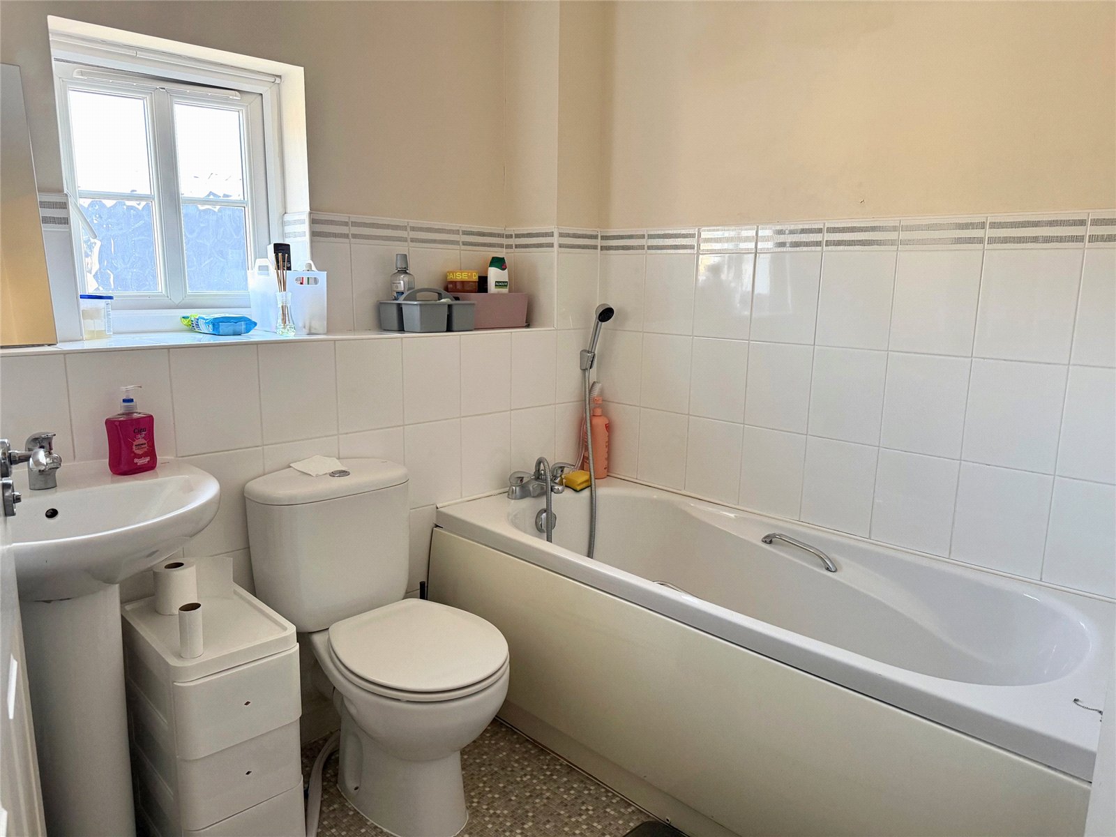 Bathroom: With a white suite comprising a panelled bath with a shower attachment, low level WC, pedestal wash basin, chrome-finish electric towel rail/radiator and an obscured double glazed window to the front.