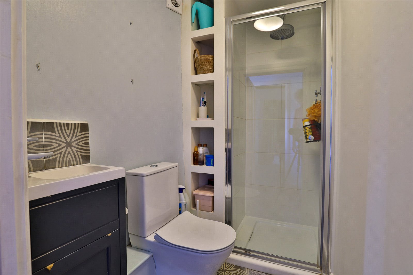 Shower Room: With a tiled shower enclosure, low level WC, vanity washbasin and storage shelving.