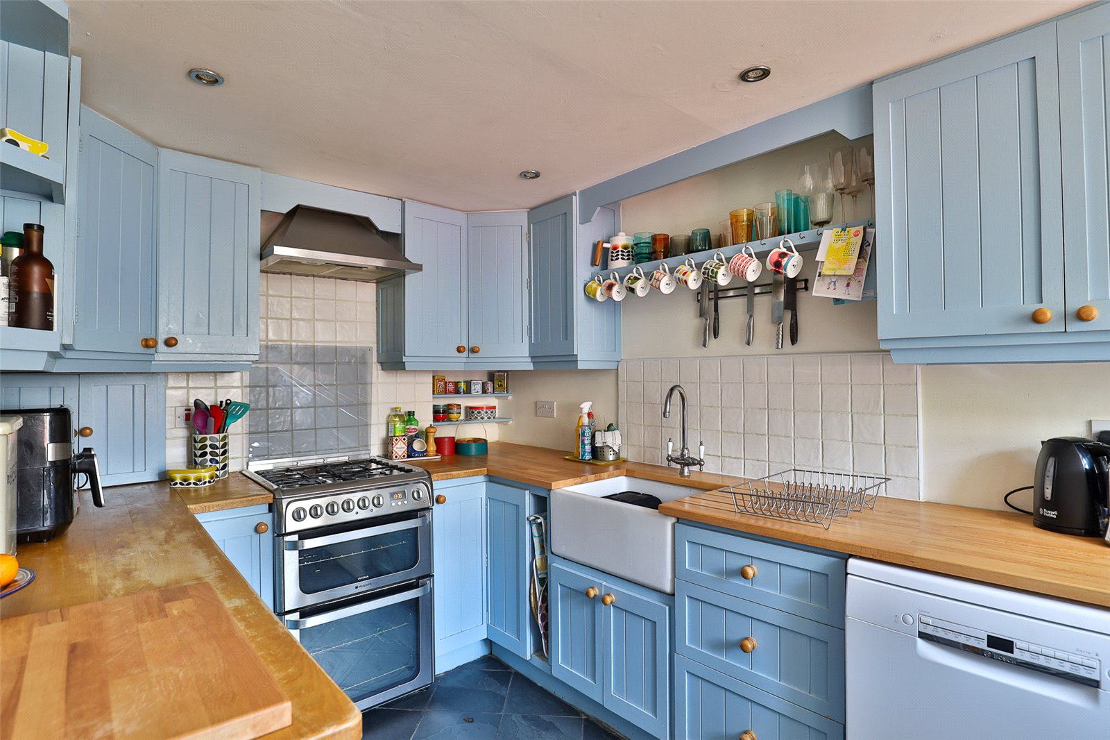 Kitchen: 12'0" x 7'8" With a range of painted wooden units and solid wood worksurfaces comprising a porcelain butlers sink with Monobloc mixer tap, adjacent worksurfaces with drawers and cupboards beneath and incorporating a slot-in stainless steel finish cooker with gas four-ring hob and electric oven, space and plumbing for a dishwasher, washing machine, fridge and freezer, eye-level cupboard units, stainless steel finish extractor hood, breakfast bar, wall-mounted Vaillant gas-fired boiler supplying domestic hot water and central heating to radiators. Stone mullion window to the front.