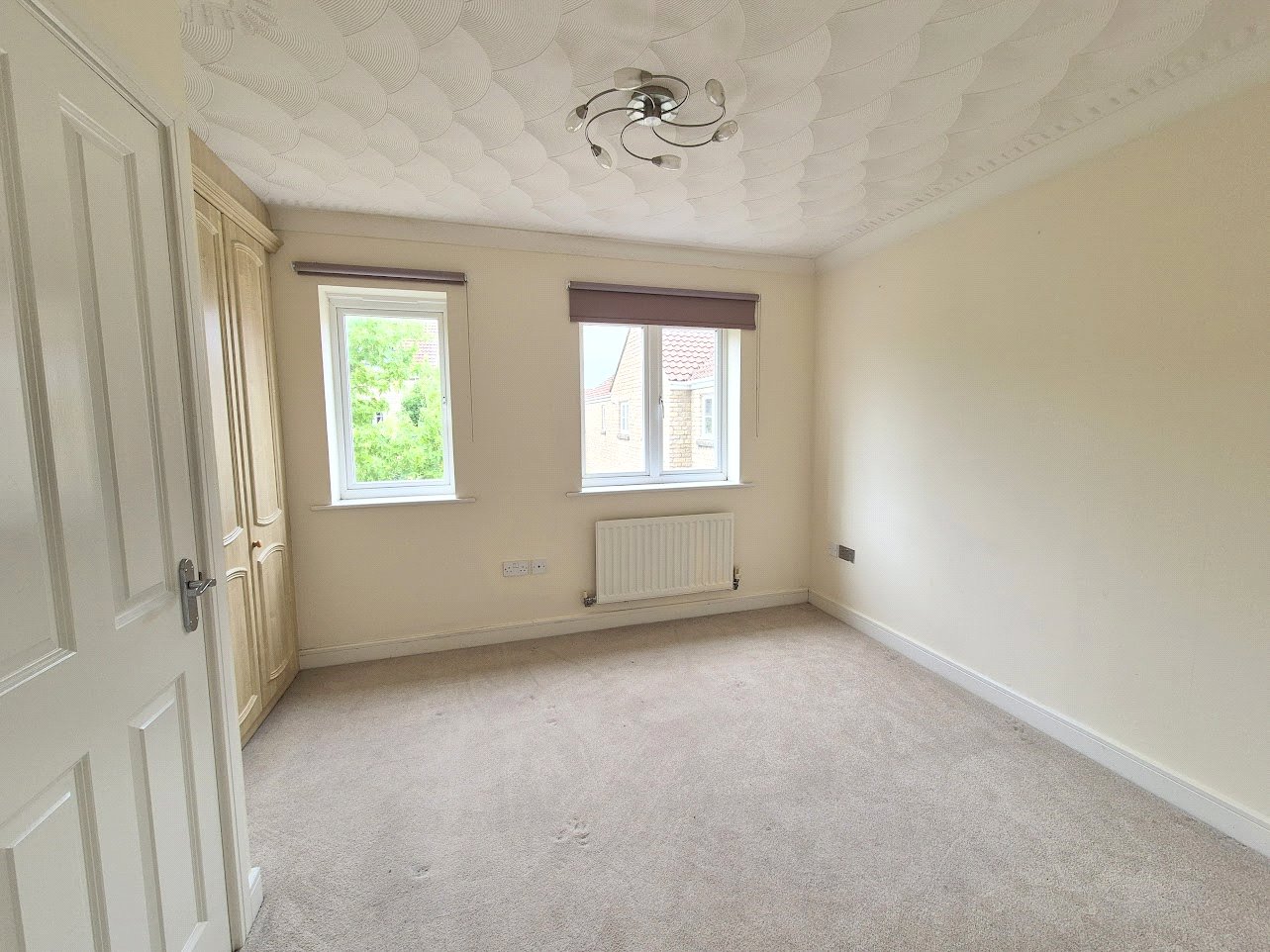 Bedroom 2: 11' x 10'7" With built-in wardrobes, over stairs cupboard with a factory lagged hot water cylinder, radiator and two double glazed windows to the front.
