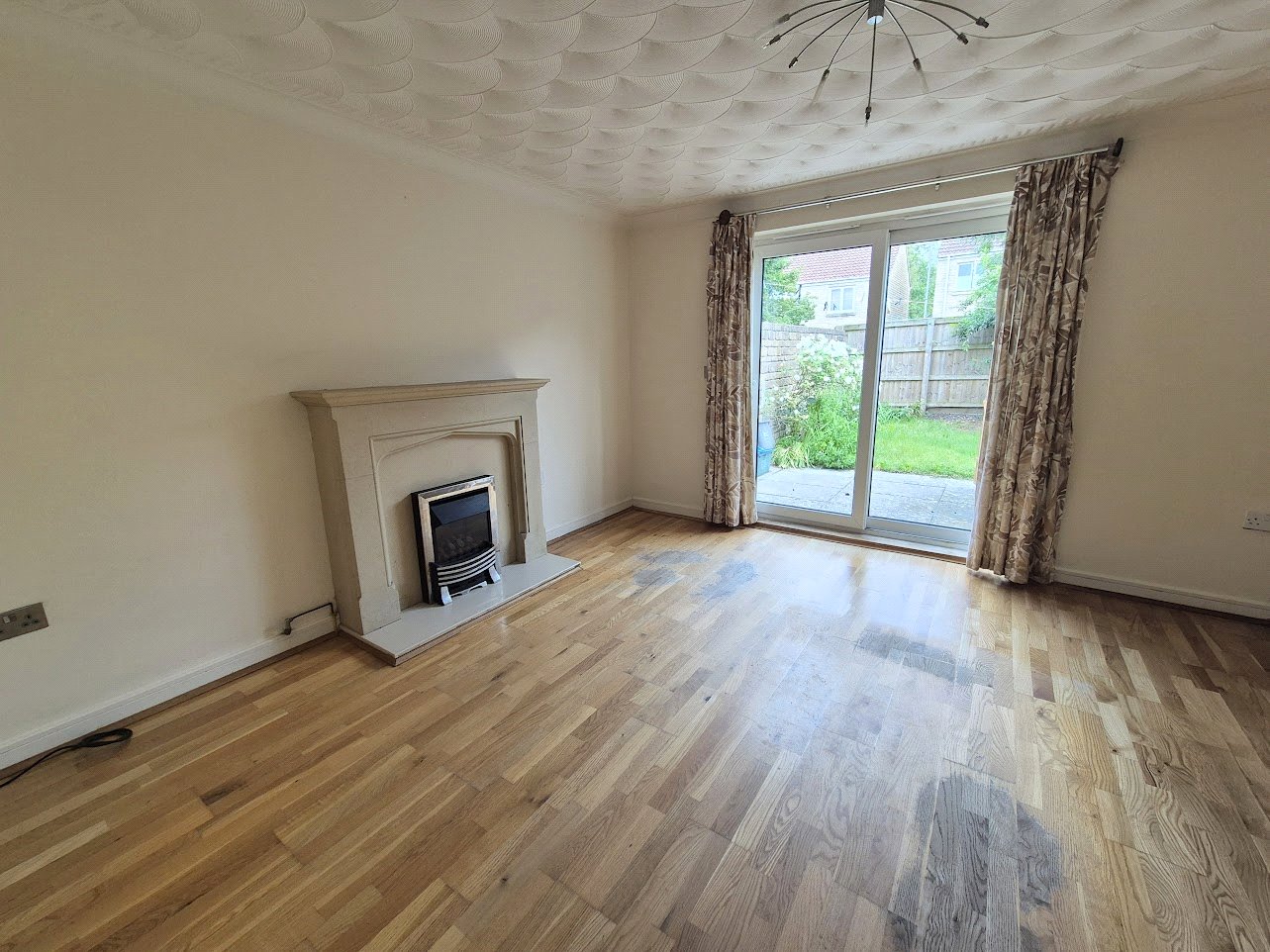 Living Room: 12'6"x12'2" With a display fireplace with electric fire, radiator and double glazed sliding patio doors onto the rear garden.