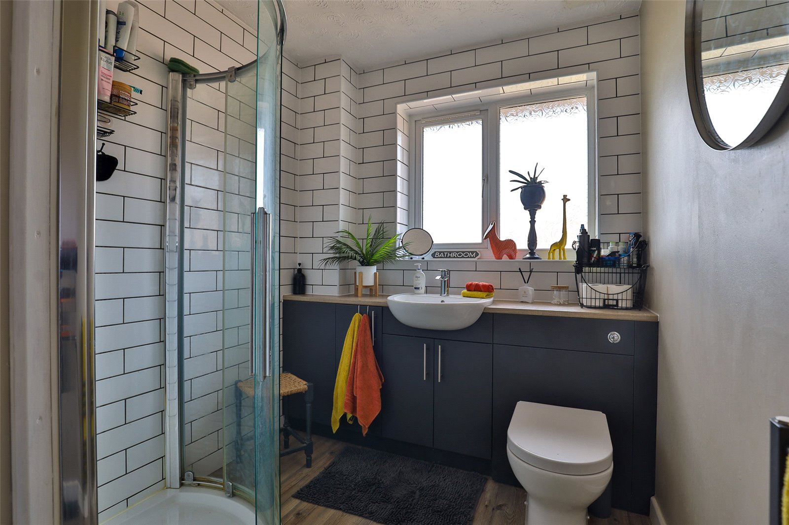 Family Shower Room: Comprising a corner entry shower enclosure with tiling and thermostatic shower, low level WC, vanity with cupboards beneath, vertical towel/radiator, airing cupboard with slatted shelves and a factory-lagged hot water cylinder. Obscured double glazed window to the front.
