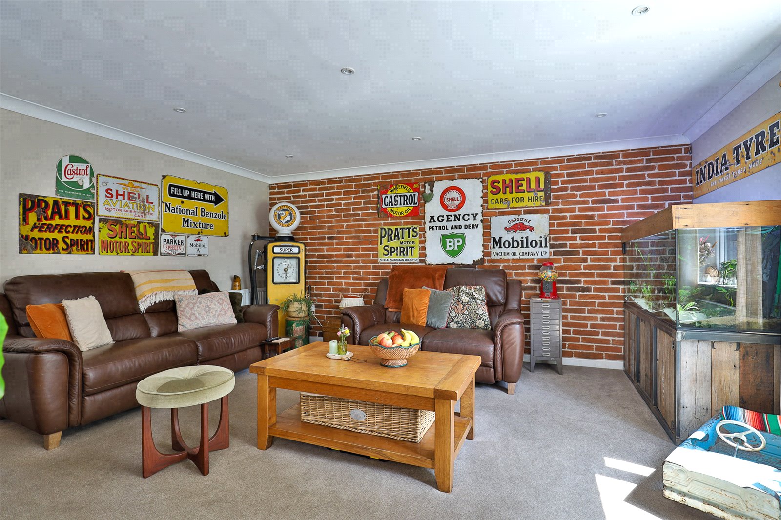 Kitchen/Dining/Family Room: 17'0" x 13'0" minimum 16'4" maximum With a comprehensive range of fitted kitchen units with a porcelain one and a half bowl single drainer sink with a Monobloc mixer tap, adjacent worksurfaces with drawers and cupboards beneath and incorporating a full-sized dishwasher, electric fan-assisted double oven, a ceramic five-ring hob, two vertical radiators, a feature brick wall, breakfast bar area and limestone tiled floor. Two double glazed windows to the front.