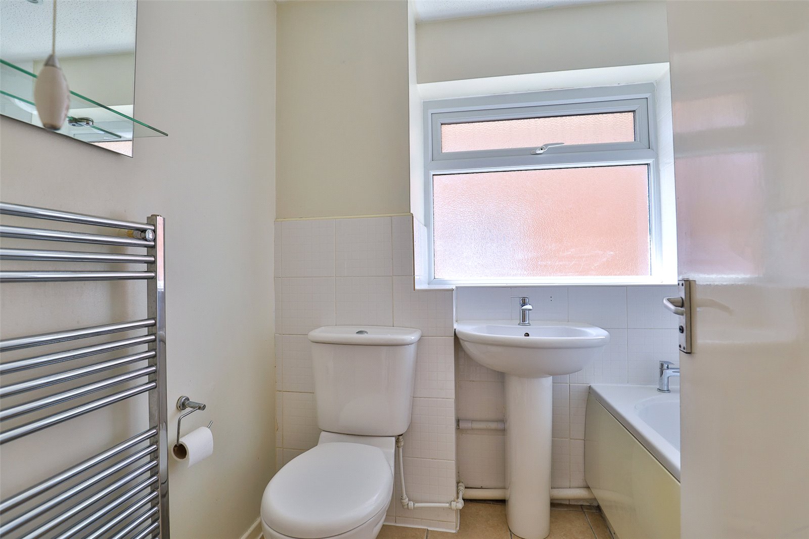 Family Bathroom: With a white suite comprising a panelled bath with adjacent ceramic wall-tiling and a thermostatic shower with a glazed shower screen, pedestal washbasin, low level WC, chrome-finish vertical towel rail/radiator and an obscured double glazed window to the side.