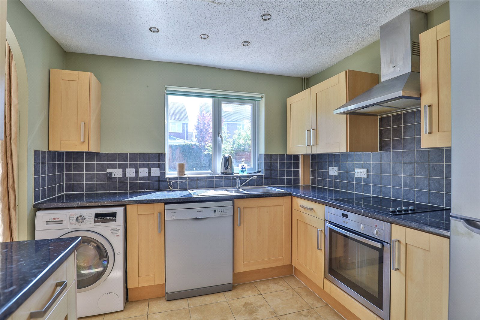 Kitchen: 9'0" x 8'7" With a ceramic tiled floor, a range of wood-effect fitted units with contrasting worksurfaces comprising a stainless steel one and half bowl single drainer sink with Monobloc mixer tap, adjacent worksurfaces with drawers and cupboards beneath and incorporating a Neff electric oven and a ceramic four-ring hob, slot-in fridge freezer, dishwasher and washing machine with dryer facility, eye-level cupboard units with stainless steel extractor hood, double glazed window to the rear and archway through to: