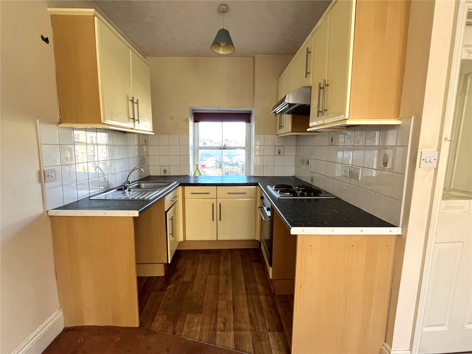 Kitchen Area: 7'8" x 7'3" With a range of cream-finish fitted units comprising a stainless steel one and a half bowl single drainer sink, adjacent work surfaces with drawers and cupboards beneath and incorporating an electric oven, four-ring electric hob with extractor hood, wall cupboard units, space and plumbing for a washing machine and space for a fridge freezer. Sash window to the rear.