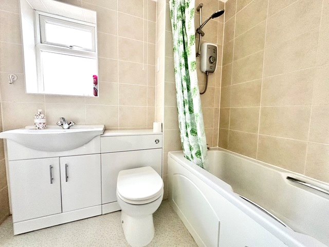 Bathroom: With a modern white suite comprising a panelled bath with adjacent wall tiling, wall mounted electric shower, low level WC with a concealed cistern, vanity wash basin, chrome finish electric filled towel rail/radiator and an obscure double glazed window to the side elevation.