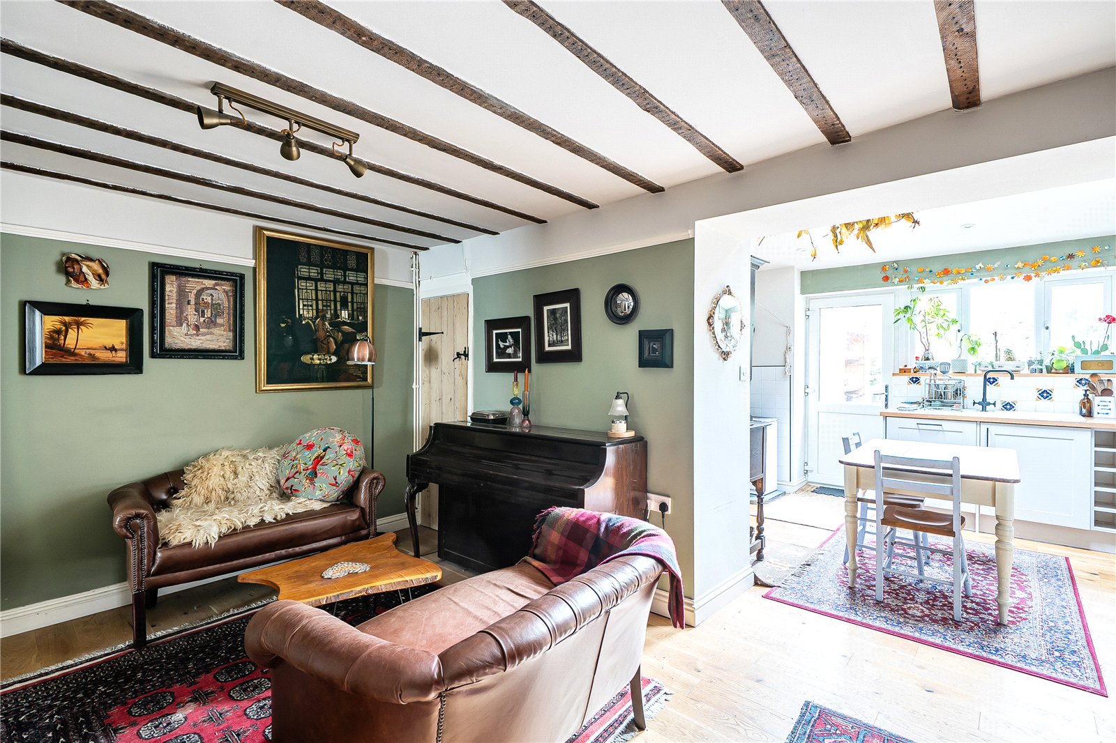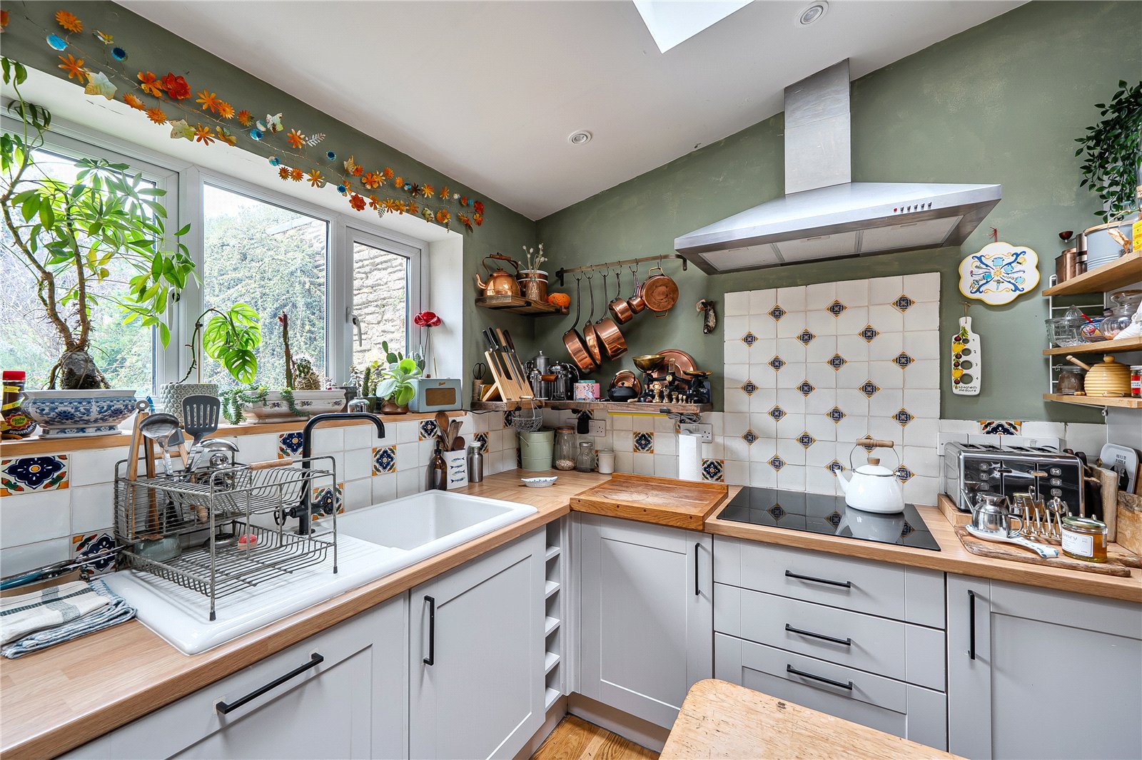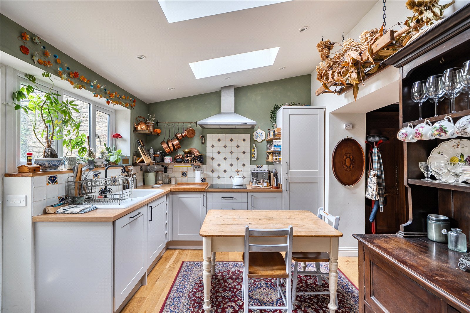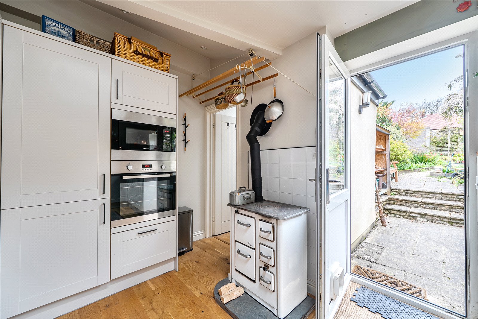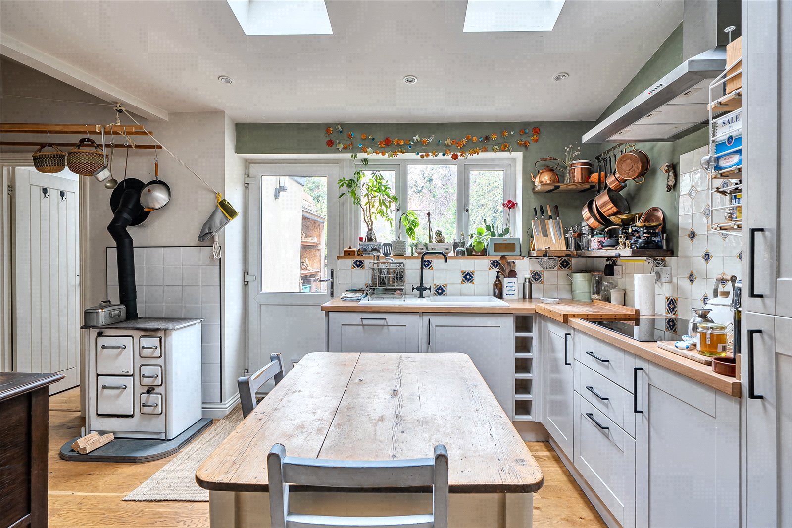 Kitchen/Breakfast Room: With a comprehensive range of fitted units with contrasting work surfaces and a porcelain single drainer sink with mono block mixer tap, adjacent work surfaces with drawers and cupboards beneath and incorporating an induction hob, full sized dishwasher, fridge/freezer, ceramic wall tiling and a stainless steel extractor hood, further base cupboard units incorporating corner storage solutions, a stainless steel finish fan assisted double oven and microwave. Double glazed window to the rear, half glazed door to the garden, two double glazed roof lights, provision (subject to the usual planning consent) to accommodate a wood burning stove with a centralised approved external flue. Wood flooring and door to: