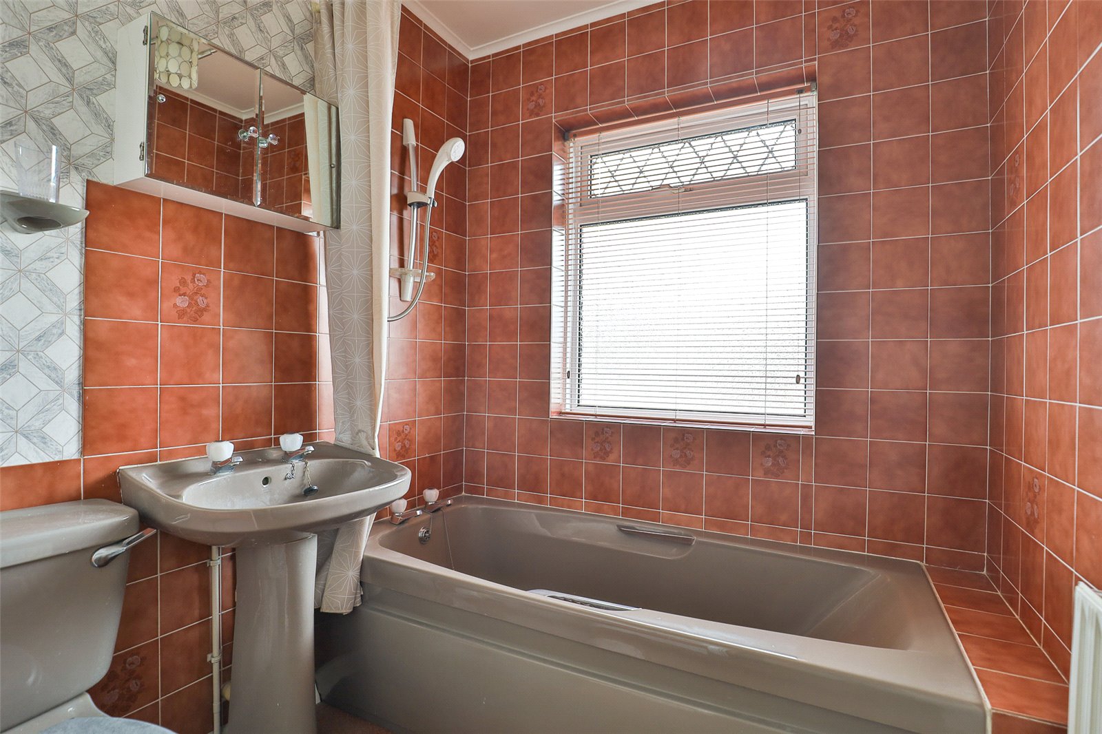 Bathroom: With a coloured suite comprising a panelled bath with adjacent ceramic wall tiling and a wall-mounted electric shower, pedestal wash basin, low level WC, radiator and an obscured double glazed window to the front.