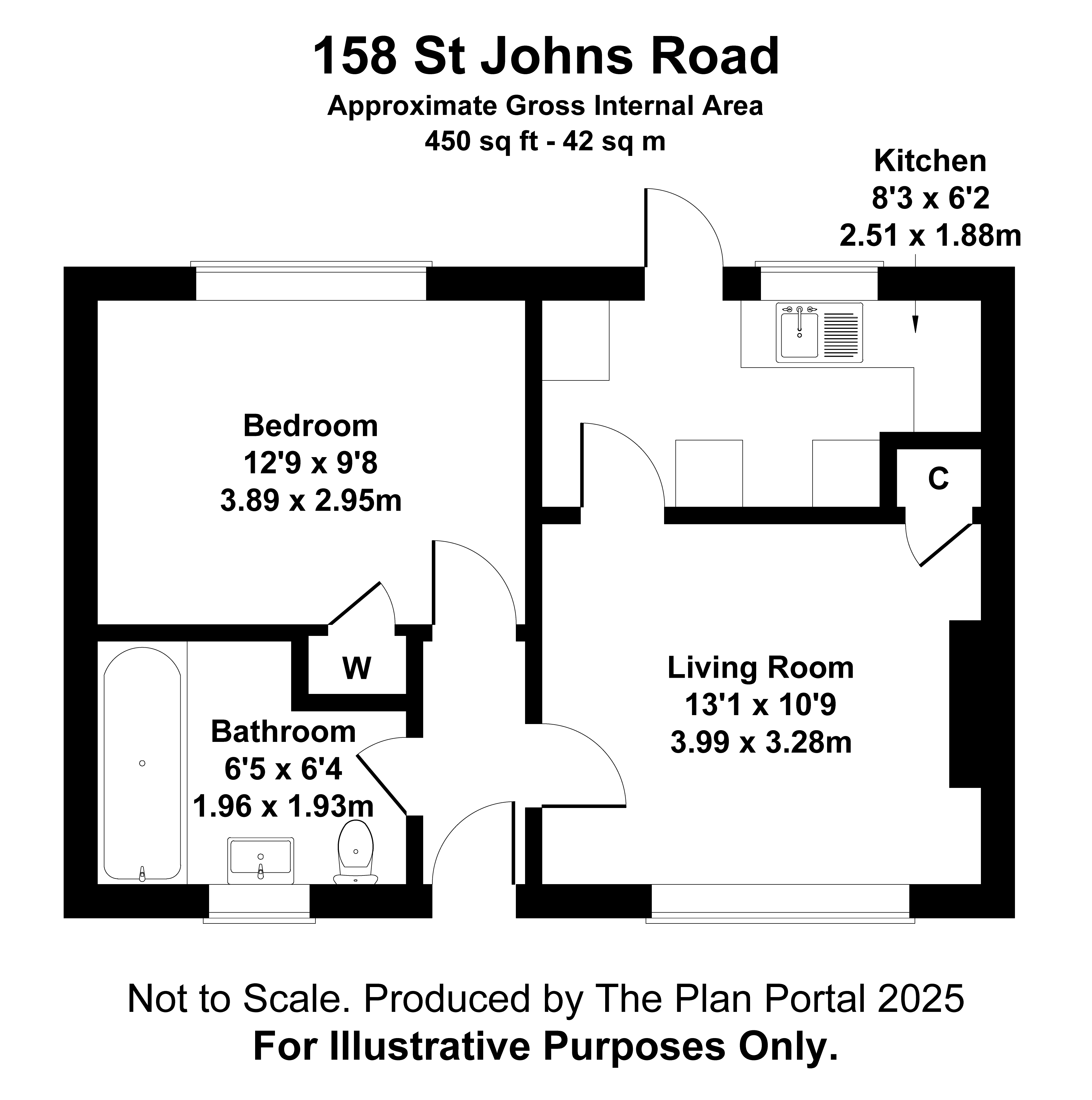 Entrance Hall: You enter into the front hall with the bathroom on your left. The bedroom lies straight ahead and the living room to the right.