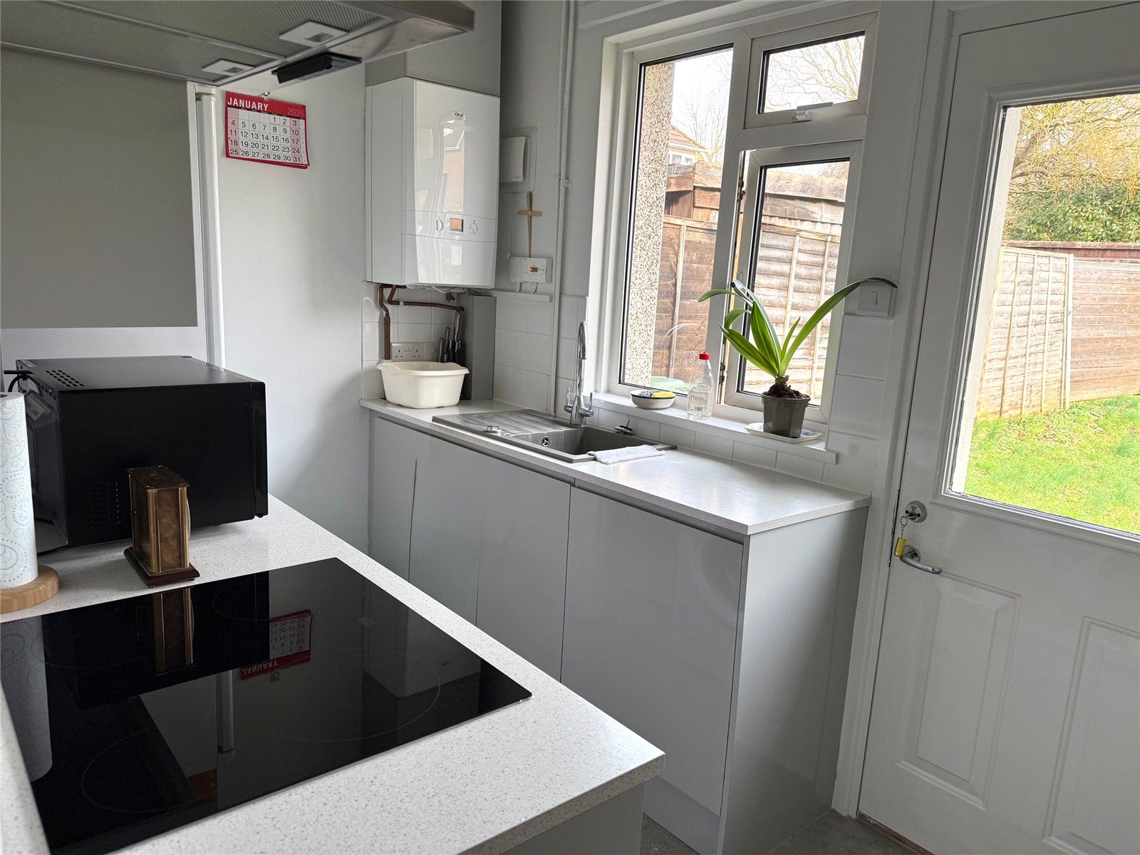 Kitchen: 10'8"x6'3" With a range of grey high gloss fitted units with contrasting work surfaces, single scratch resistant sink with mono bloc mixer tap, adjacent work surfaces with drawers and cupboards beneath and incorporating an electric oven, ceramic four ring hob, space and plumbing for a washing machine and fridge/freezer. Wall mounted Ideal gas fired combination boiler supplying domestic hot water and central heating to radiators, double glazed window to the rear and a half glazed door to the rear garden. Single radiator.