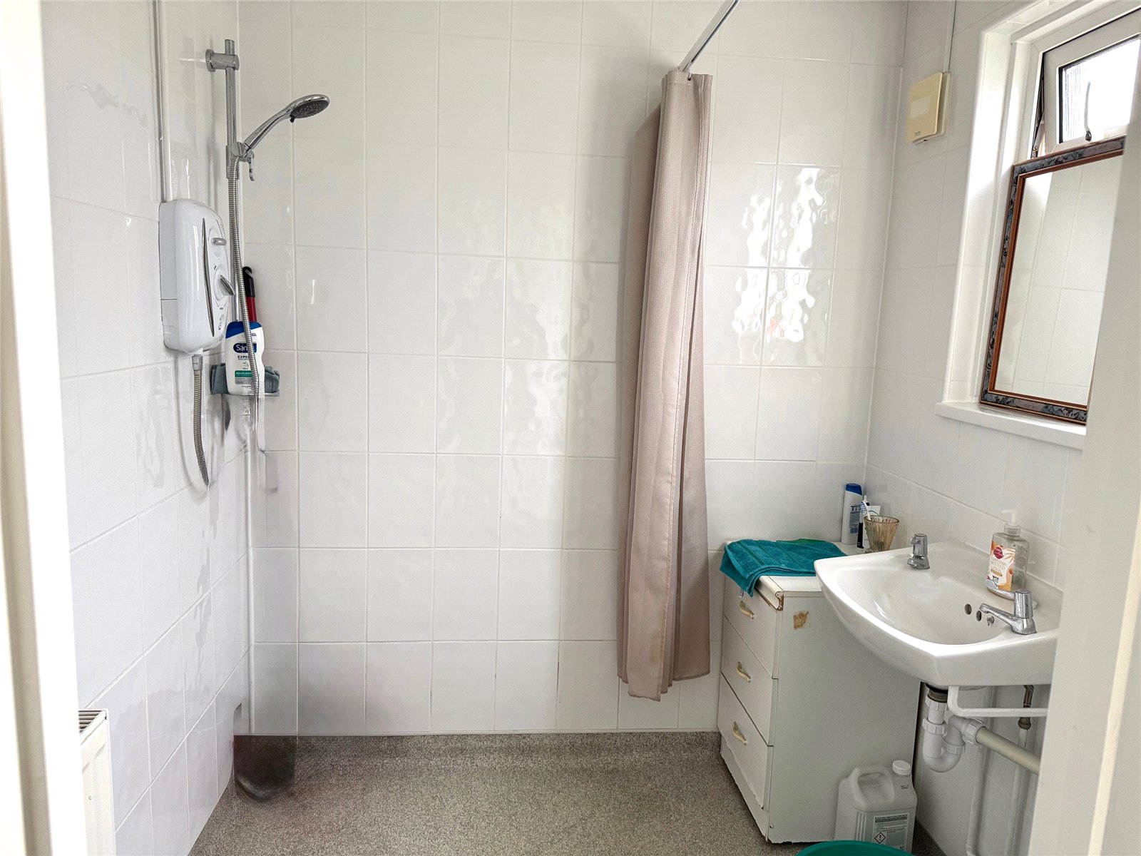Shower Room: This wet room shower has a wall mounted electric shower, complete ceramic wall tiling, low level WC, wash basin, radiator and an obscure double glazed window to the front.