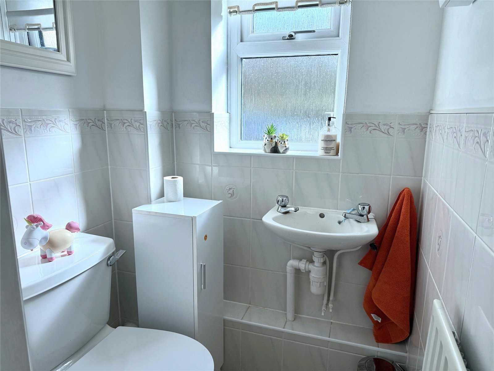 Cloakroom: With a white suite comprising a low level WC, wash basin, radiator and a double glazed window to the front.