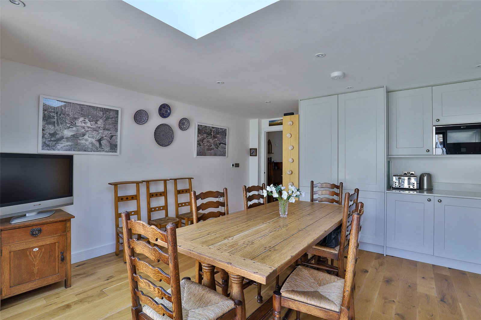 Kitchen/Dining Room: 15'6' maximum x 15'5" With a comprehensive range of pale grey finish fitted units with Quartz work surfaces comprising a one and a half bowl stainless steel single drainer sink with mono bloc mixer tap, adjacent work surfaces incorporating an AEG induction five ring hob, double oven integrated fridge, freezer and full sized dishwasher, wall cupboard units incorporating a plate rack, combination microwave/cooker and extractor hood with splash back, engineered oak floor, roof light and double glazed bi-fold doors onto the rear garden.