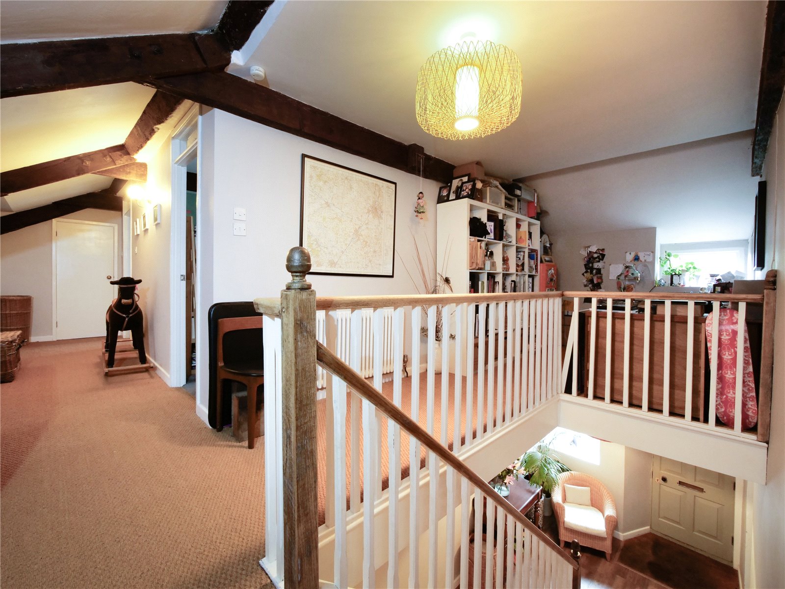 Galleried Landing: With a study area, exposed beams, radiator and linen cupboard with a gas fired boiler and pressurised hot water cylinder. Doors to: