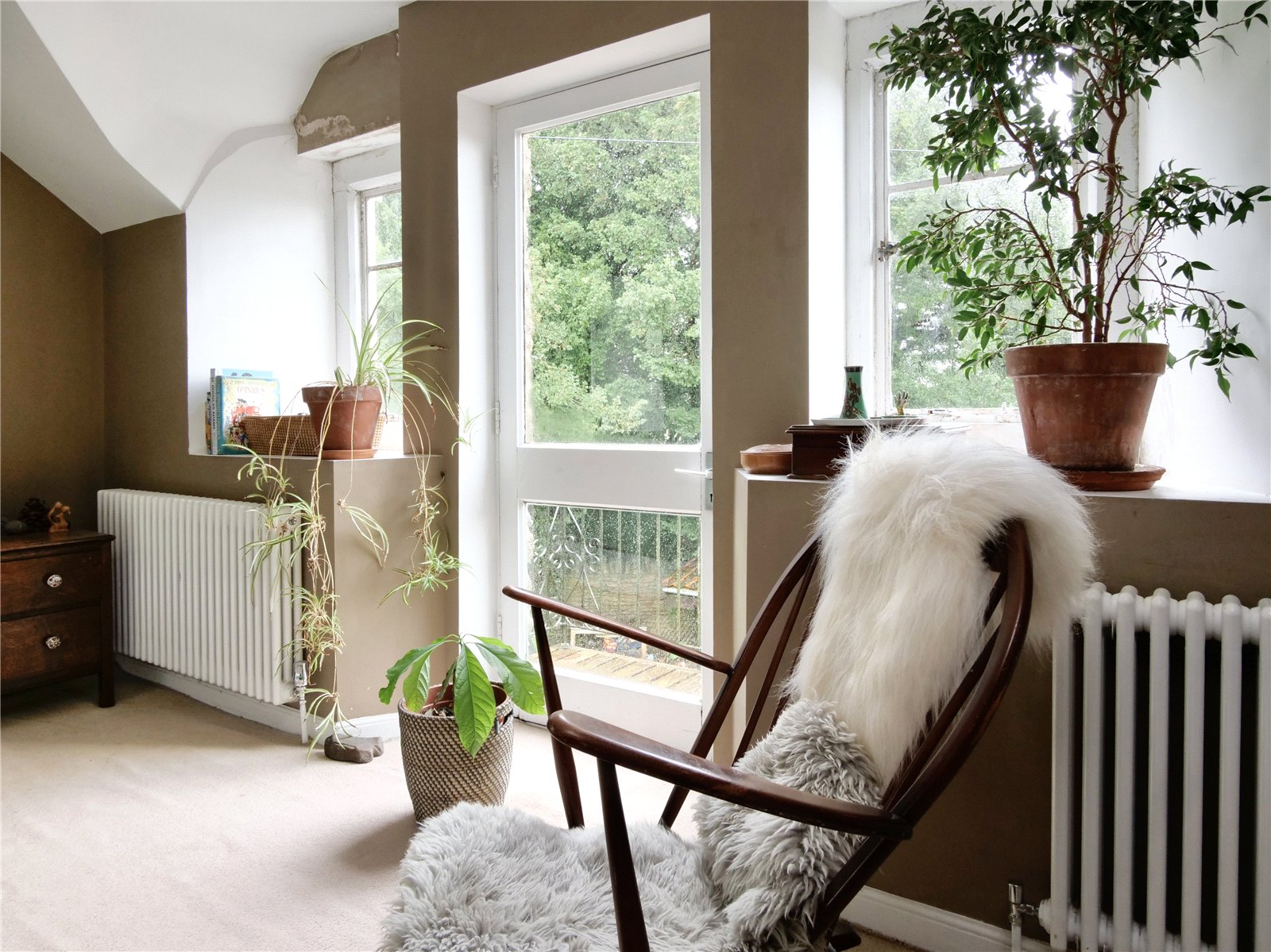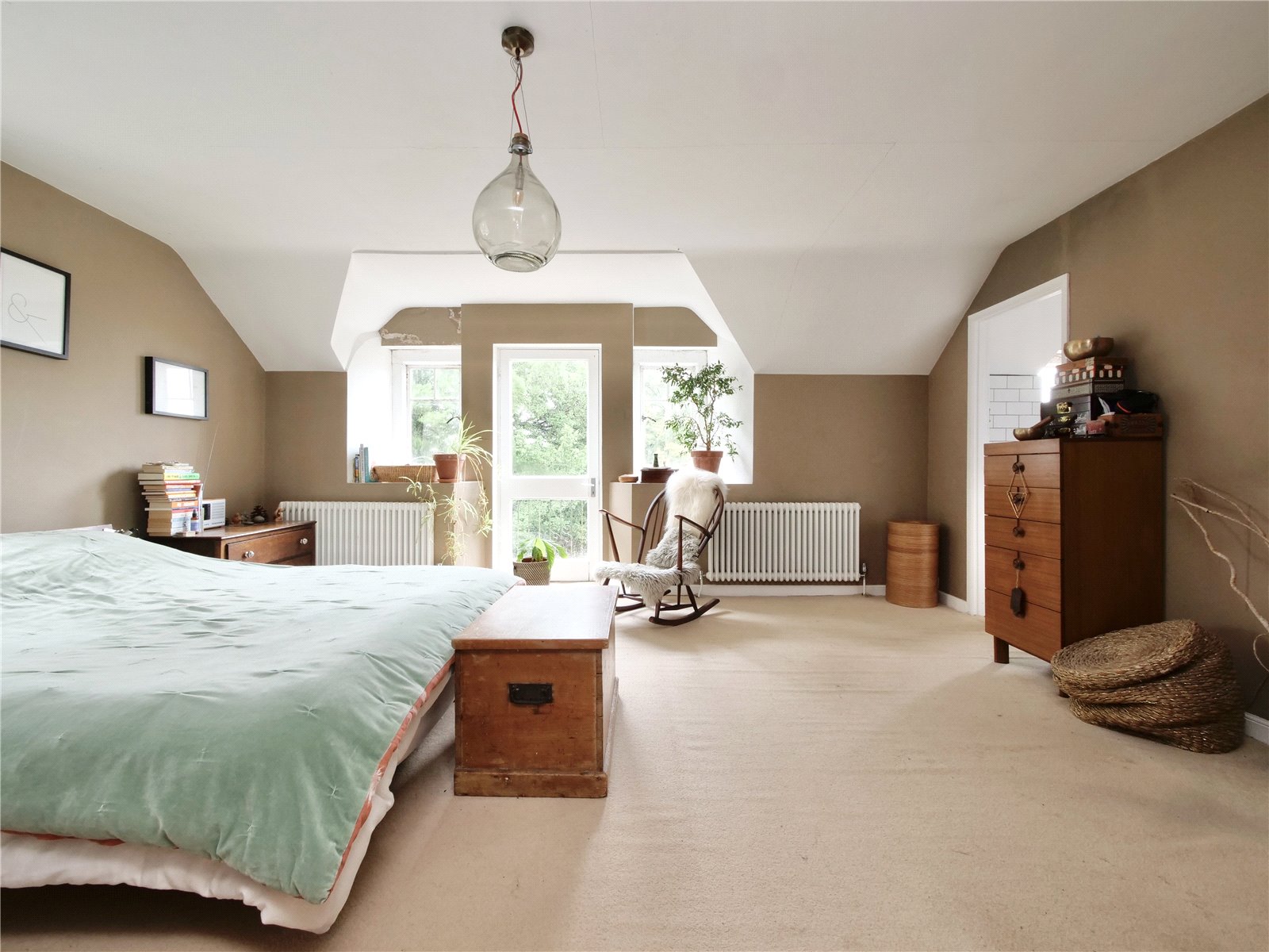 Principal Bedroom: 17'1" average x 16'10" With two radiators, windows to the side and rear with a glazed door to a balcony area. Door to: