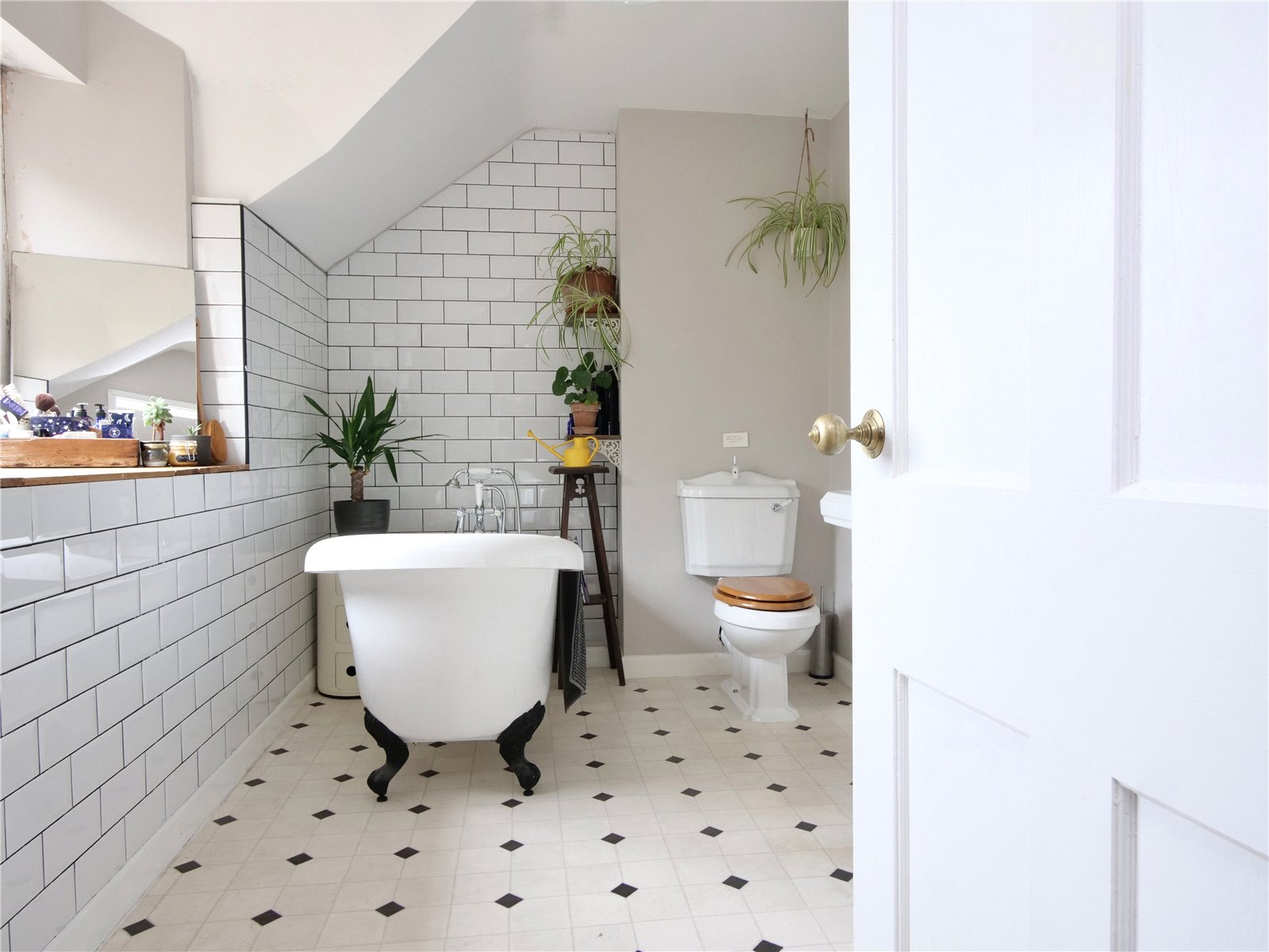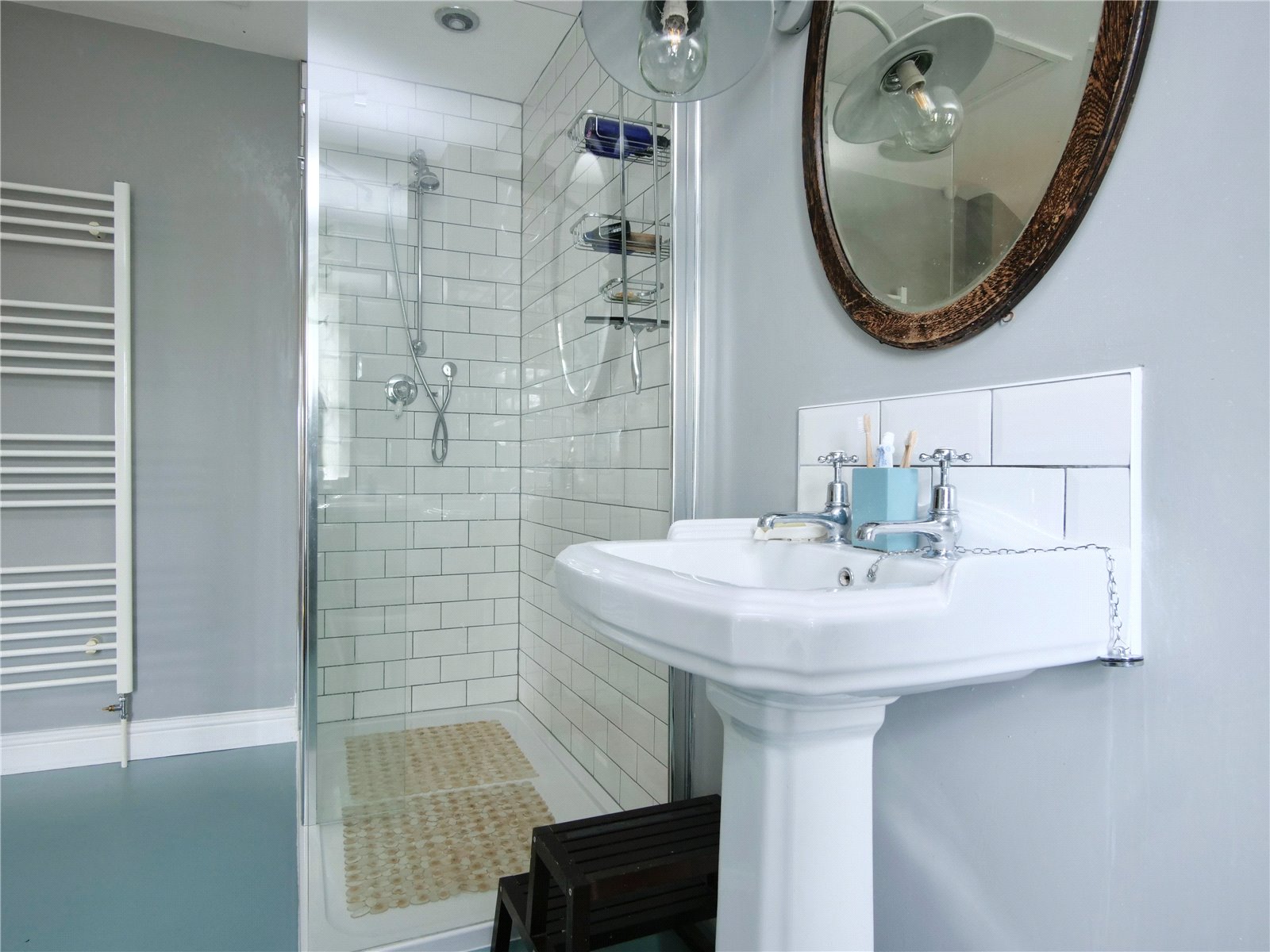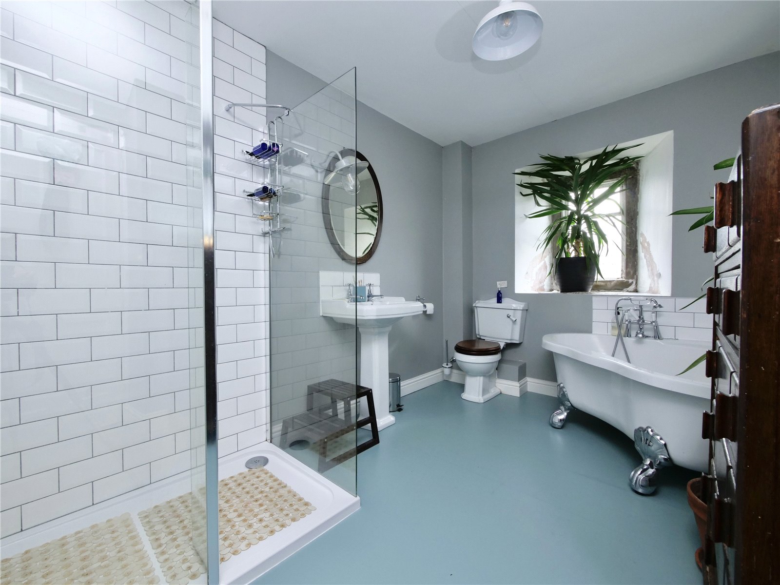 Family Bathroom: With a corner bath with claw and ball feet and shower attachment, low-level WC, pedestal wash basin, tiled shower enclosure with a shower attachment, vertical towel rail/radiator and window.