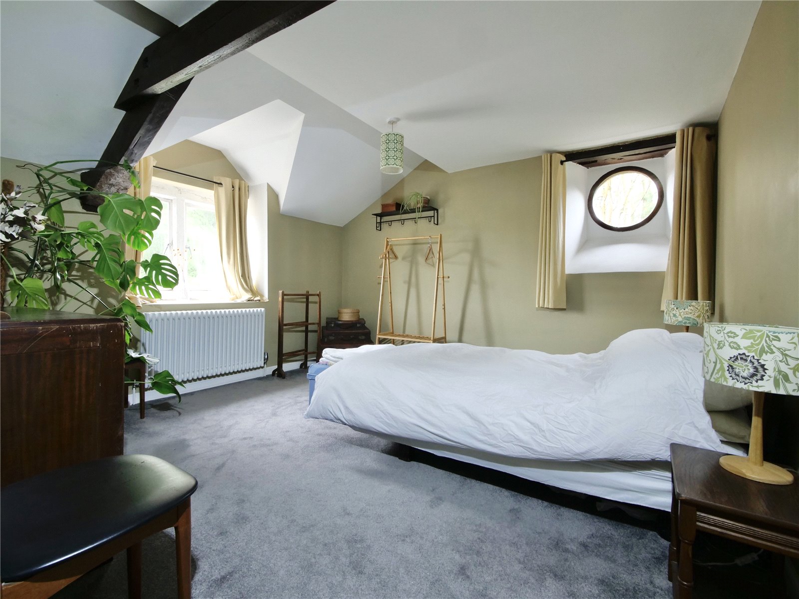 Bedroom 5: 12'9"x12'5" With a stone mullion window to the front with porthole window to the side. Radiator.