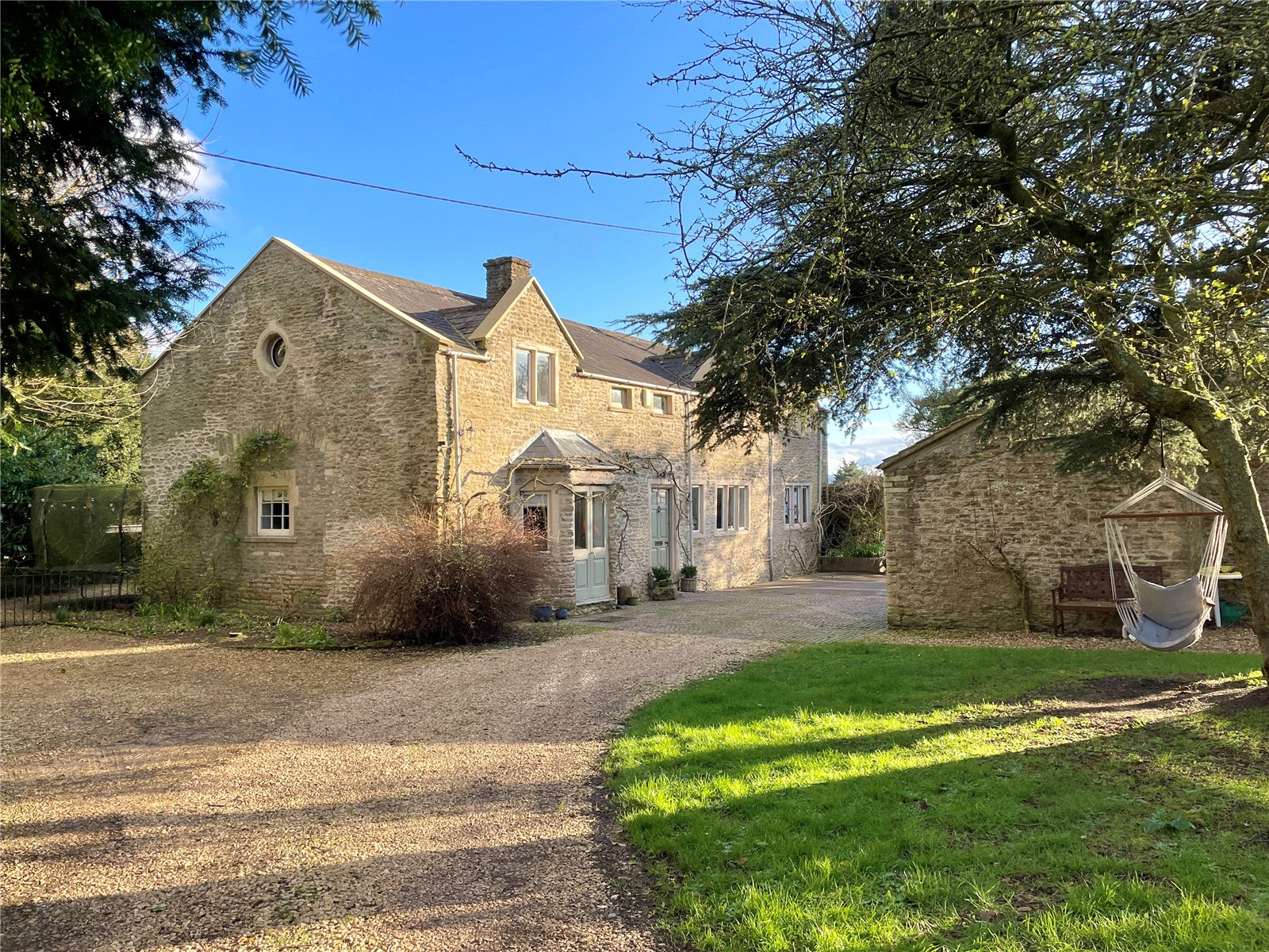 *A large modern country home – formerly a coach house from the 1800s – set in an acre of land with 5 bedrooms, 3 bathrooms, private gardens, solar panels and a sizeable outbuilding ready for refurbishment as a studio or Airbnb. Accessed via a horseshoe drive, the house lies in an acre of land divided between a private courtyard to the back of the property, a landscaped garden and small paddock area with a chicken coop and carport.