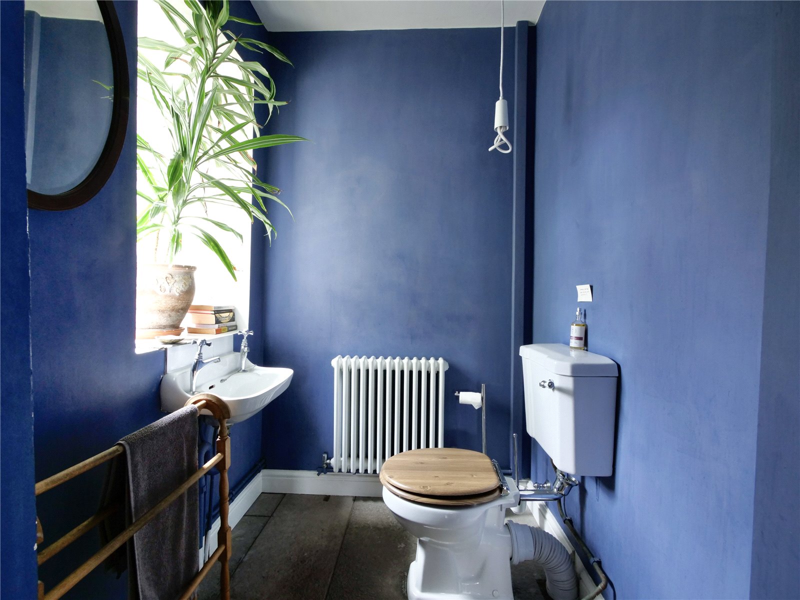 Cloakroom: With a white low level WC, wash basin, deep finned radiator and obscure double glazed window.