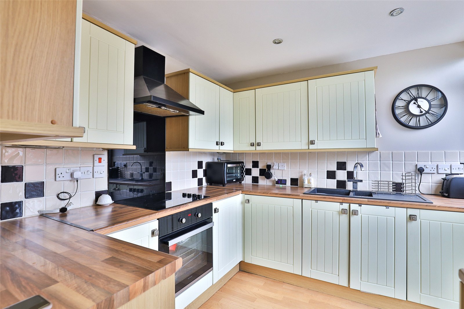Kitchen: With a range of cream fitted units with contrasting work surfaces comprising a one and a half bowl scratch resistant single drainer sink adjacent work surfaces with drawers and cupboards beneath and incorporating an electric oven, ceramic four ring hob, integrated, oven, hob, fridge, freezer and washing machine. Eye level cupboard units incorporating an extractor hood, double glazed window and an obscure double glazed door to the rear garden.