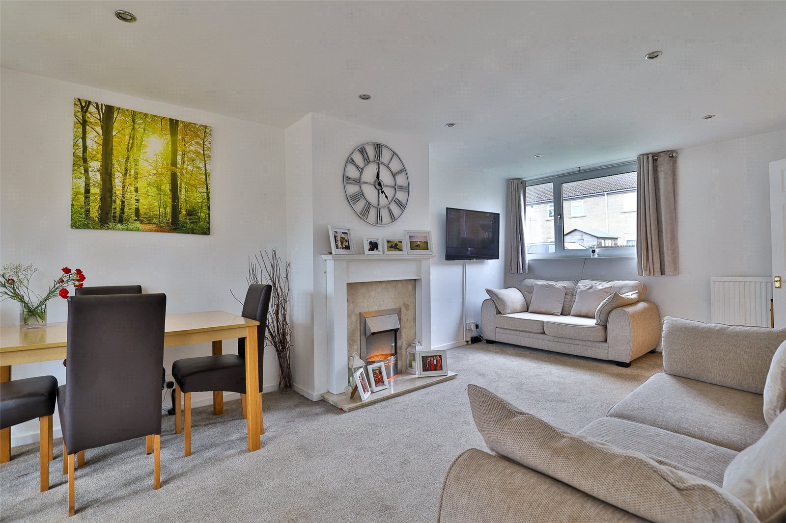 Lounge/Dining Room: With an electric living flame fire with decorative surround, two radiators, a double glazed window to the front, door to the kitchen and double, sealed double glazed French doors onto: