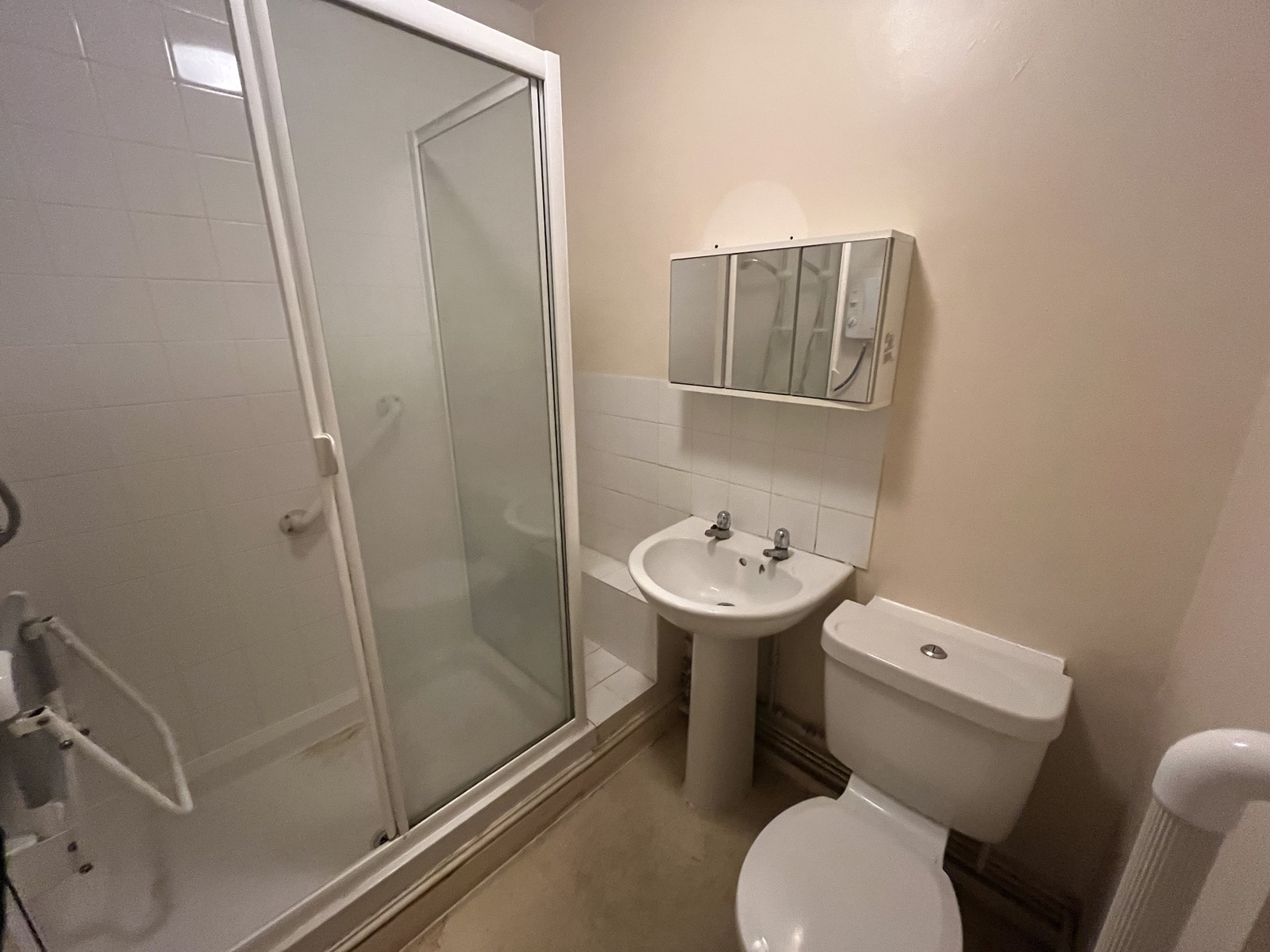 Wet Room Shower: With a low-level WC, wash basin and shower area with a wall mounted electric shower.